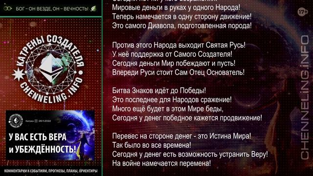 КОММЕНТАРИИ К СОБЫТИЯМ, ПРОГНОЗЫ, ПЛАНЫ, ОРИЕНТИРЫ ✔ Видео носит ОЗНАКОМИТЕЛЬНЫЙ характер! Для полного, глубокого и осознанного прочтения, заходите на сайт ПЕРВОИСТОЧНИКА: https://chenneling.info/poems/2022-11-28 ? Телеграм-канал "Новости от СОЗДАТЕЛЯ" https://t.me/Novosti_ot_SOZDATELYA/513 ? Информационно-дискуссионный Портал https://doktrina.info/ ? Читать книгу "Доктрина Создателя" https://doktrina.info/doktrina-sozdatelya/ ? Слушать эфир РАдио Вечность онлайн (24\7): http://vechnost.myrh.ru https://pcradio.ru/radio/radio-vechnost ? Телеграм-канал РАдио Вечность https://t.me/radiovechnost ? Группа РАдио в ВК: https://vk.com/radiovechnost © Radio Vechnost Production 2022 #КатреныСоздателя #Вера #Убеждённость #ВключайВечность #Посланник #ШестаяЭпоха #МасловЛеонидИванович #Пророк #КвантовыйПереход #Творец #ОтецАбсолют #Всевышний #ТакГоворитСоздатель #ДоктринаБудущего #ВысшийКосмическийРазум #ИстинаОдна