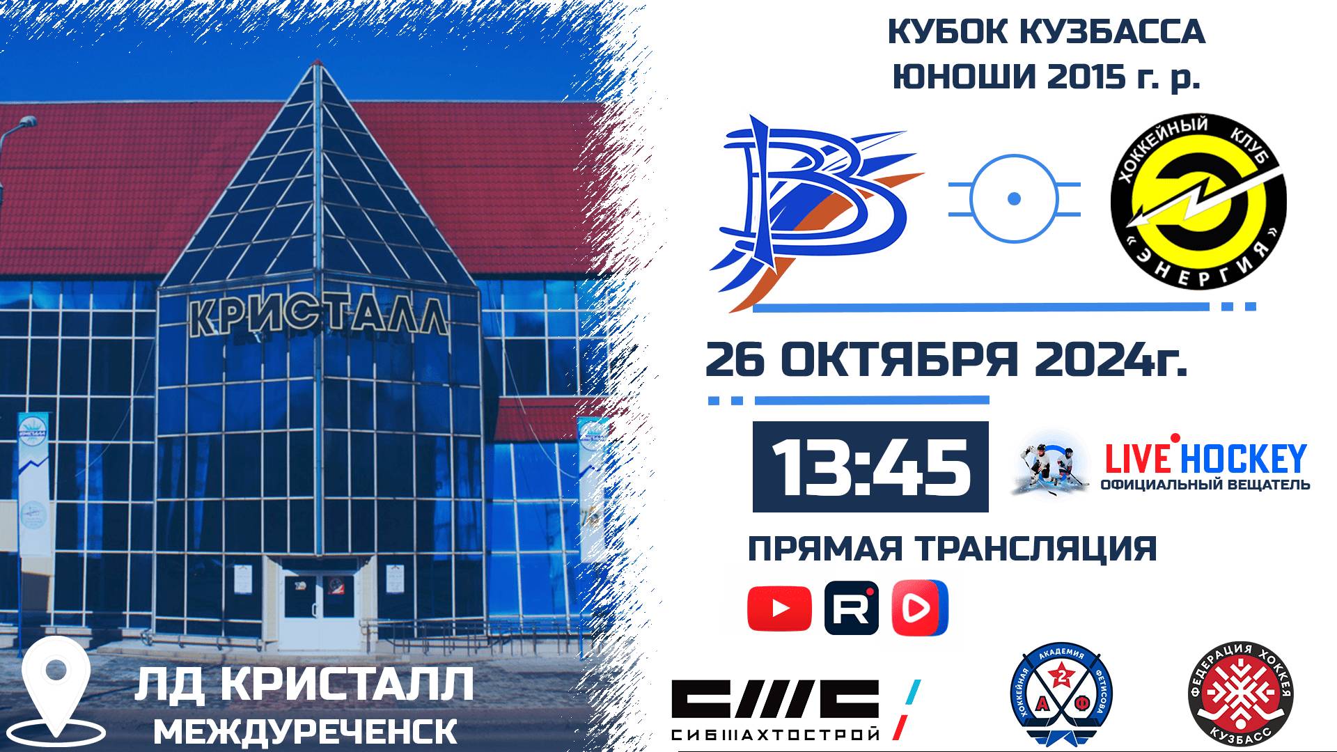ПРЯМАЯ ТРАНСЛЯЦИЯ МАТЧА 26.10.2024г. в 13.45 ВЫМПЕЛ 2015 (Междуреченск)-БУРЕВЕСТНИК 2015 (Томск). КУБОК КУЗБАССА. Сезон 24-25. КУБОК КУЗБАССА. Сезон 2024-2025. Комментаторы: Графика: С графикой (таймер, табло). Стадион: ЛД КРИСТАЛЛ. г. Междуреченск. ТРАНСЛЯЦИЯ НА YouTube: https://youtube.com/live/H3VOoZ8At34?feature=share ТРАНСЛЯЦИЯ В СООБЩЕСТВЕ VK: