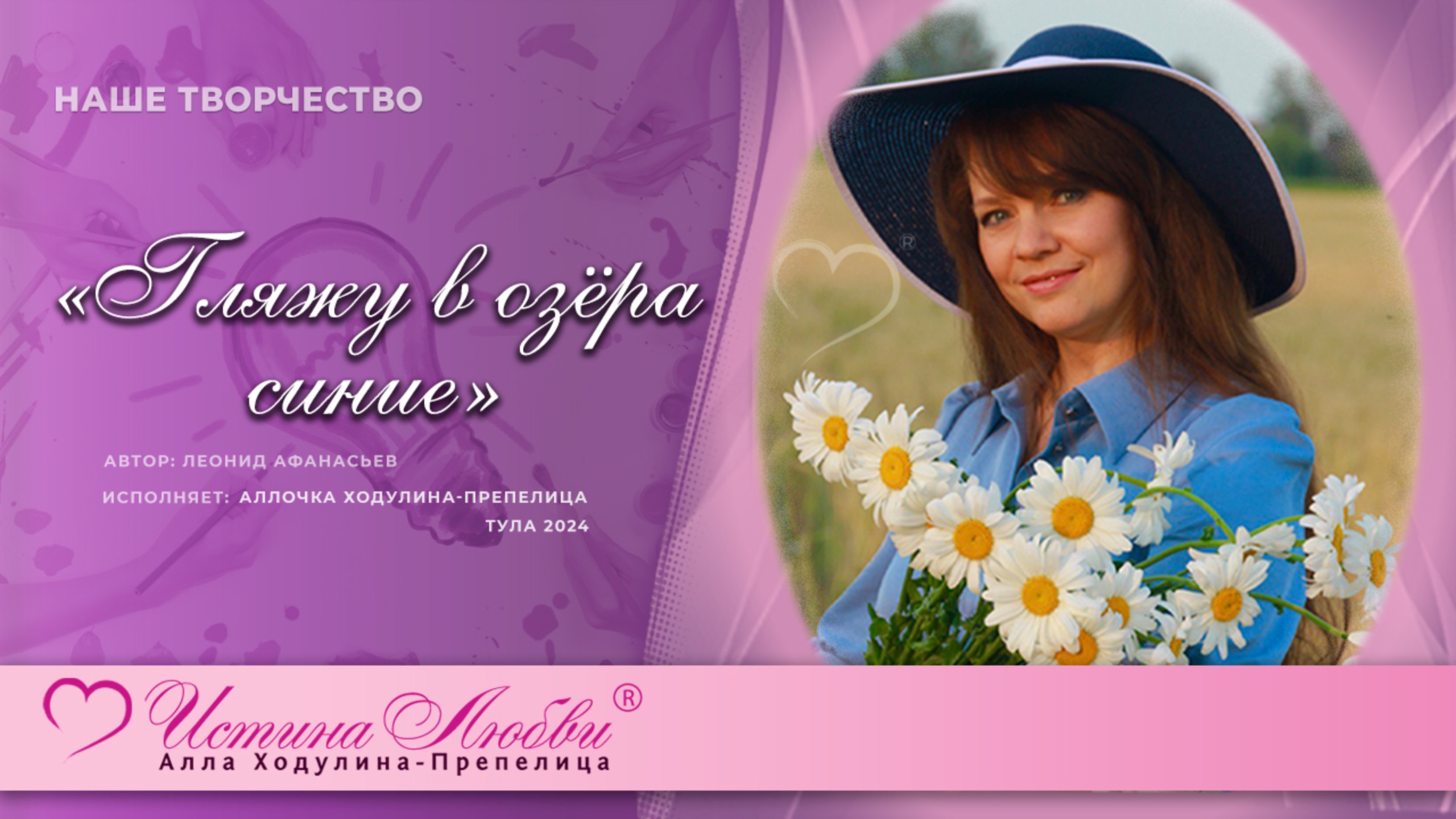 На одном из ежегодных семинаров школы, всех ждал подарок от нашего любимого Учителя - Аллочки. Так нежно и с любовью мы называем Аллу Ходулину-Препелице, автора учения и основателя онлайн-школы и пространства «Истина Любви». Вдруг на экране появилась красивая картинка широких полей нашей Родины, и зазвучал нежный голос, который наполнил нас и весь зал искренней любовью к России и волшебным звучанием. Как же было неожиданно увидеть микрофон в руках Аллочки, которая исполняла песню на слова Игоря Шаферана и композитора Леонида Афанасьева «Гляжу в озера синие». И песня раскрылась по-новому из уст Аллочки, и глубина стала бездонная, и любовь к Родине почувствовалась ярче и значимей. Благодарим тебя, Аллочка, эта песня поистине спета Душой. Сайт Истина Любви https://istinaliubvi.com/ ВКонтакте https://vk.com/istina_liubvi Телеграмм https://t.me/istinaliubvi_kanal Дзен https://dzen.ru/istinaliubvi Одноклассники https://ok.ru/istinali