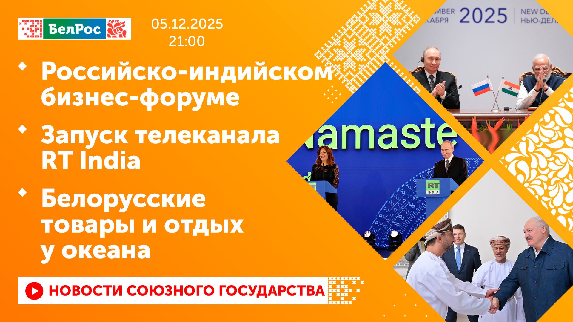 Закадровый текст озвучивает *ИИ Антон* Новости 05.12.2025 на 21:00 - Владимир Путин и Нарендра Моди выступил на российско-индийском бизнес-форуме. - Владимир Путин дал старт вещанию телеканала RT India. - Государственный визит Владимира Путина завершился приёмом от имени Президента Индии. - Беларусь и Оман запускают проект - целлюлознокартонный комбинат. - Беларусь создаст в Омане хаб для поставок товаров в Азию и Африку. - Беларусь осваивает Оман как туристическое направление. - Беларусь, Алжир и Оман займутся производством сложных удобрений. Смотрите главные новости Союзного государства на телеканале БелРос. Ссылки на наши соц. сети Сайт: http://belros.tv/ Telegram: https://t.me/belrostv Одноклассники: https://ok.ru/group/55657426976918 ВКонтакте: https://vk.com/belrostv TikTok: https://www.tiktok.com/@belros_tv?_t=... RuTube: https://rutube.ru/channel/23501830/ Яндекс. Дзен: https://zen.yandex.ru/belrostvv Наши подкасты на Яндекс. Музыке: https://music.yandex.ru/album/25615251 #главныеновости #новостисегодня #СоюзноеГосударство