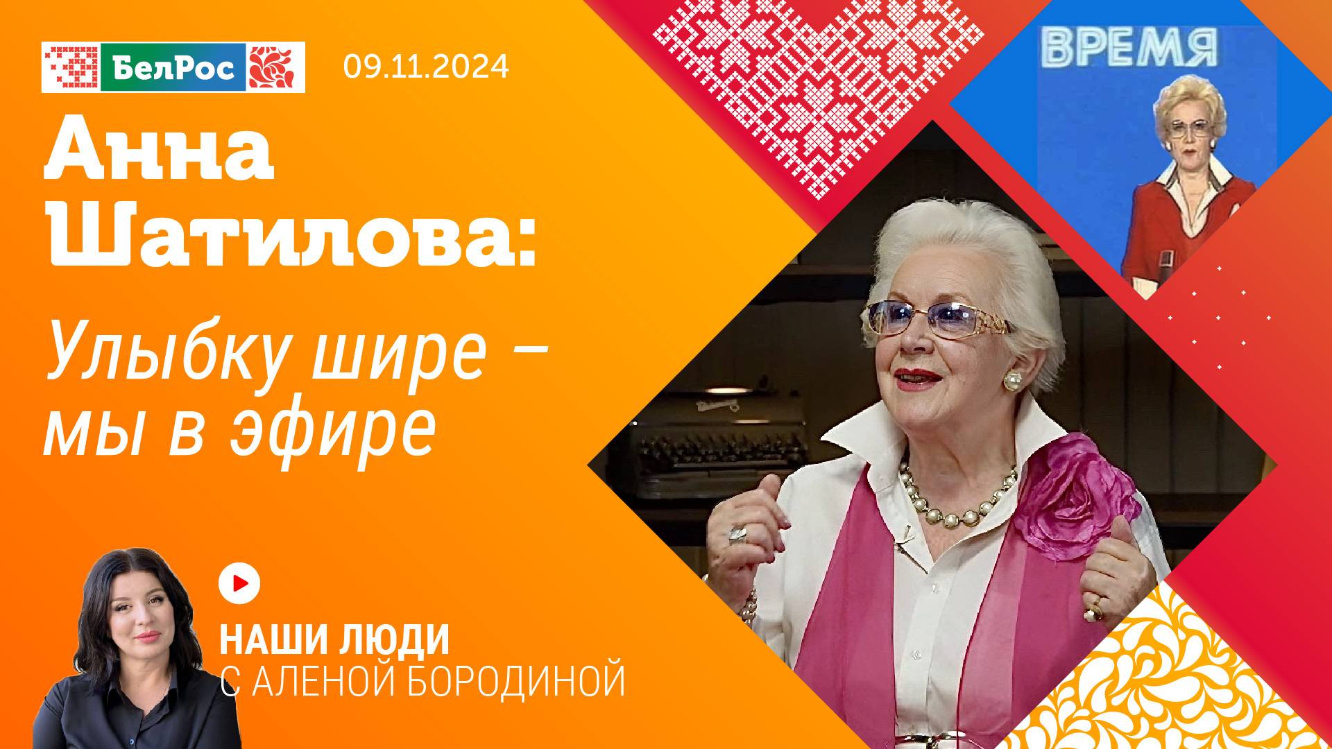 ⚡️ АННА ШАТИЛОВА — советский и российский диктор центрального телевидения Гостелерадио СССР, теле- и радиоведущая, актриса, народная артистка — в гостях у программы "Наши люди" "Говорит и показывает Москва! Внимание!" 🖇Анна Шатилова - легендарная ведущая, икона стиля, лицо и голос страны. Она вела программы «Время» и «Новости», парады Победы, «Голубые огоньки». Её союзу с телевидением больше 60 лет. 🔵Анна Николаевна расскажет о закулисье советского телевидения: "Мы знали, что прическа хорошо держится на пиво, но даже пиво толком нельзя было купить" 🔵О случаях сложных: "Читаю этот невычитанный текст и вдруг вижу, какую гадость преподнесли народу" 🔵И смешных: "Открываю - вложены деньги и рецепт: "Купите мне такую же оправу, как у вас" 🔵Об ответственности перед зрителем: "Громыко в своей речи сказал: "Международная обстановка обОстрилась". Сама корреспондент нашла это слово, вырезала ножницами, склеила, и он своим голосом "обострИлась" 🔵О любви к Беларуси: "По-моему, Минск уже затмил Европу" 🔵И к жизни: "Я обожаю юмор, я тоже люблю посмеяться" ❗️Ведущая нового выпуска программы - Алена Бородина. ✨Эксклюзивные кадры - на телеканале «БелРос». Эфир: 09.11.2024 Ссылки на наши соц. сети Сайт - http://belros.tv/ Telegram - https://t.me/belrostv Одноклассники - https://ok.ru/group/55657426976918 ВКонтакте - https://vk.com/belrostv TikTok - https://www.tiktok.com/@belros_tv RuTube - https://rutube.ru/channel/23501830/ Яндекс. Дзен - https://zen.yandex.ru/belrostvv Наши подкасты на Яндекс. Музыке - https://music.yandex.ru/album/25615251 #АннаШатилова #диктор #телеведущая