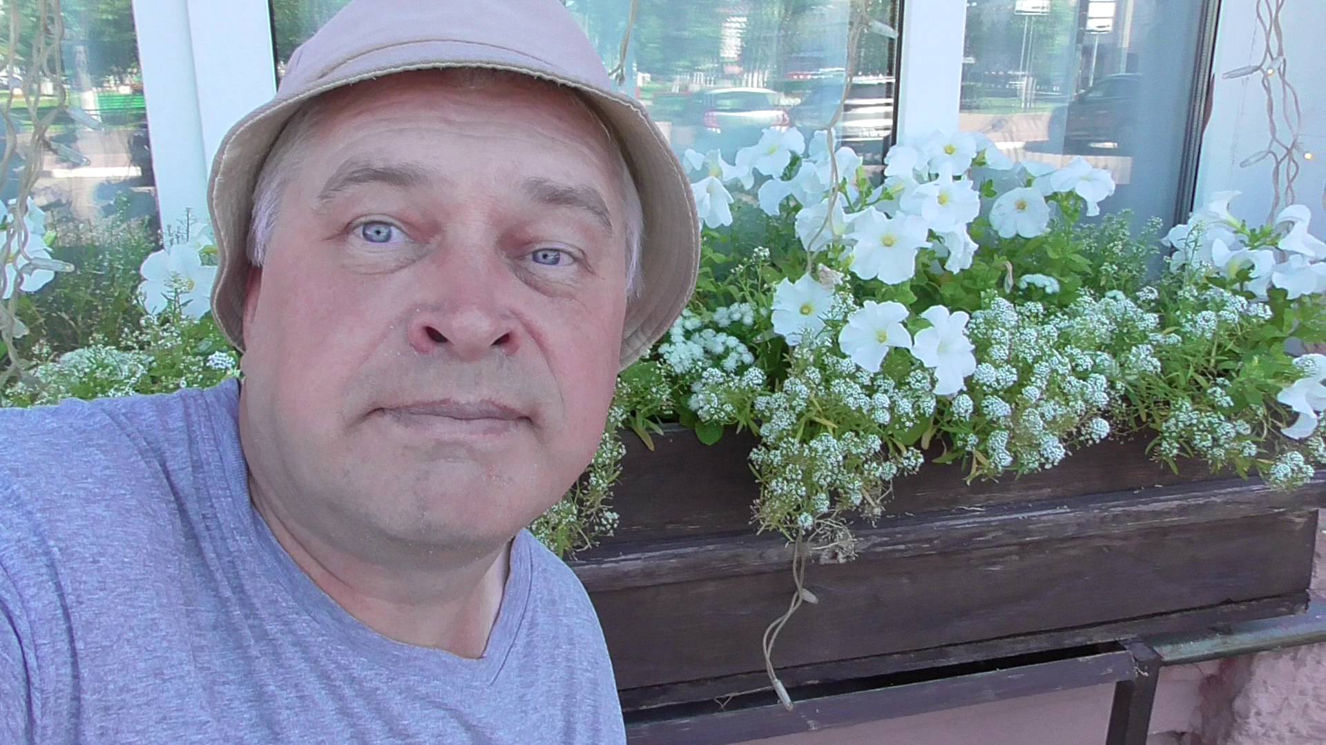 Геннадий Горин в городе. Белые цветы петуния