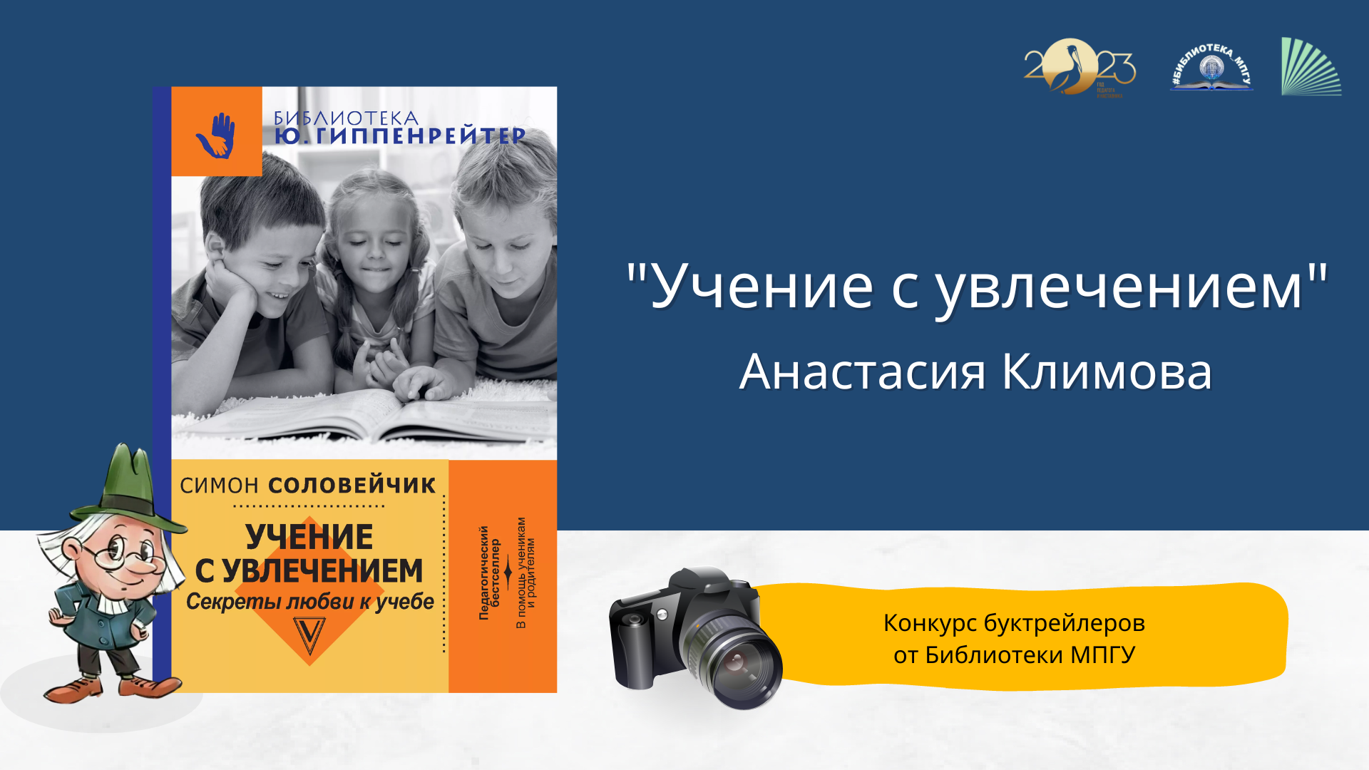 В мае 2023 года, в рамках Года педагога и наставника, Библиотека МПГУ проводит конкурс буктрейлеров "Наш друг Пишичитай: педагоги и наставники на страницах любимых книг". Анастасия Климова рассказывает о книге Симона Соловейчика "Учение с увлечением".