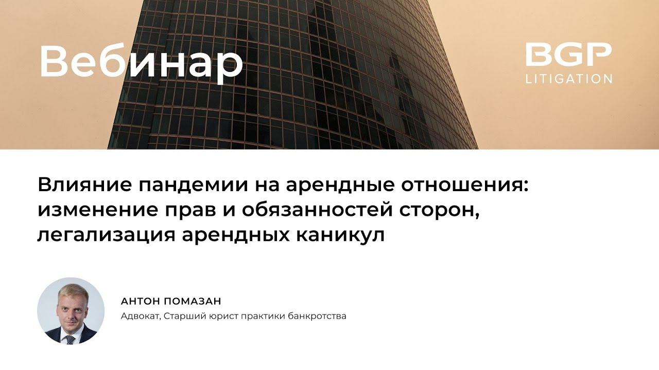 Программа вебинара: • Обзор введенных мер поддержки в условиях пандемии, связанных с изменением размера арендной платы или предоставлением отсрочки арендных платежей • Изменение (расторжение) в судебном порядке договора аренды в связи с существенным изменением обстоятельств • Ответственность сторон договора аренды в условиях пандемии за неисполнение обязательств Спикер - Антон Помазан, адвокат, старший юрист практики банкротства BGP Litigation Присоединяйтесь к BGP Litigation в социальных сетях: ▪️Facebook https://www.facebook.com/bgplitigation ▪️Telegram https://msto.me/card1620203889/ Связаться с нами: ▪️https://bgplaw.com ▪️office@bgplaw.com ▪️+7 (495) 777 28 20