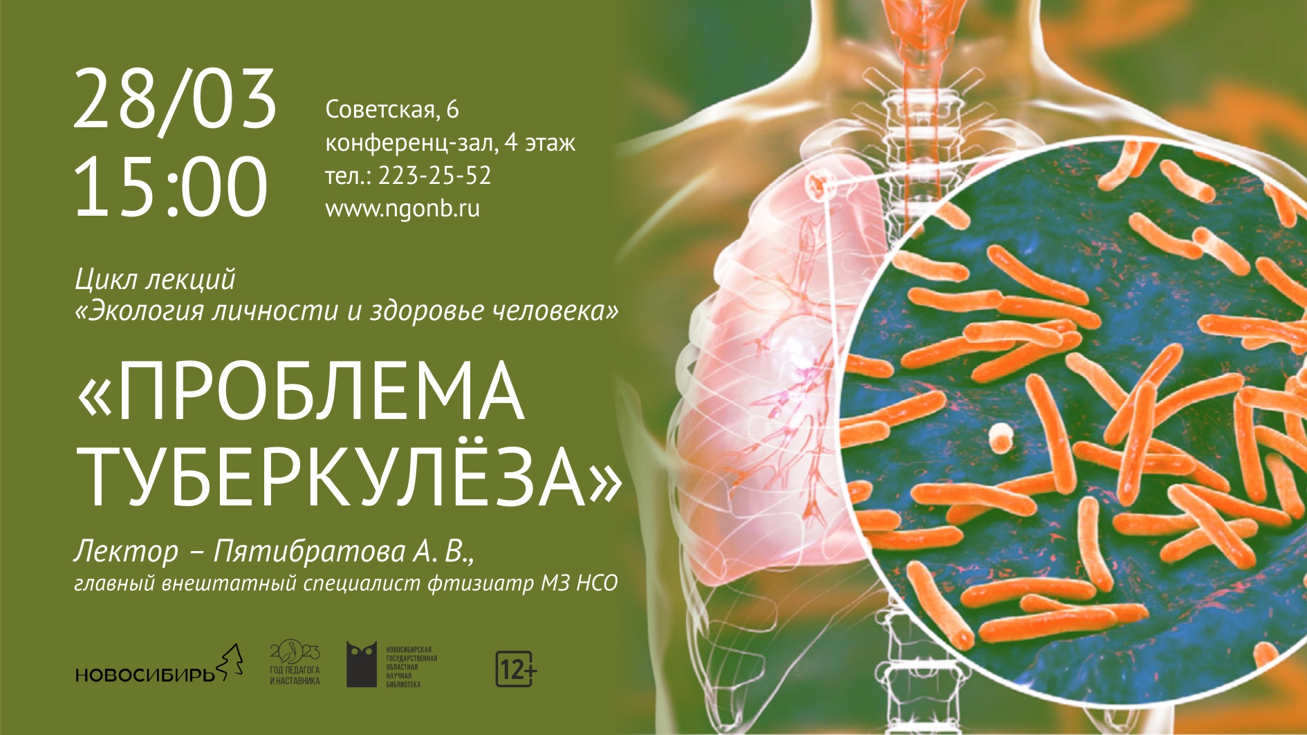 Заболеваемость туберкулезом в России является одной из серьезнейших социальных проблем и борьба с ней рассматривается как важнейшая государственная задача. Решение этой задачи невозможно без понимания населением опасности этой инфекции и представления об основных принципах профилактики. На самые актуальные вопросы о туберкулёзе ответит Изупов Валерий Анатольевич, заместитель главного врача по амбулаторно-диагностической помощи ГБУЗ НСО ГОНКТБ. Также с докладом "Курение как фактор риска развития туберкулёза", выступит Дергачева Елена Николаевна, заместитель директора ГКУЗ НСО "Региональный центр общественного здоровья и медицинской профилактики". НГОНБ. 28 марта 2023 года.