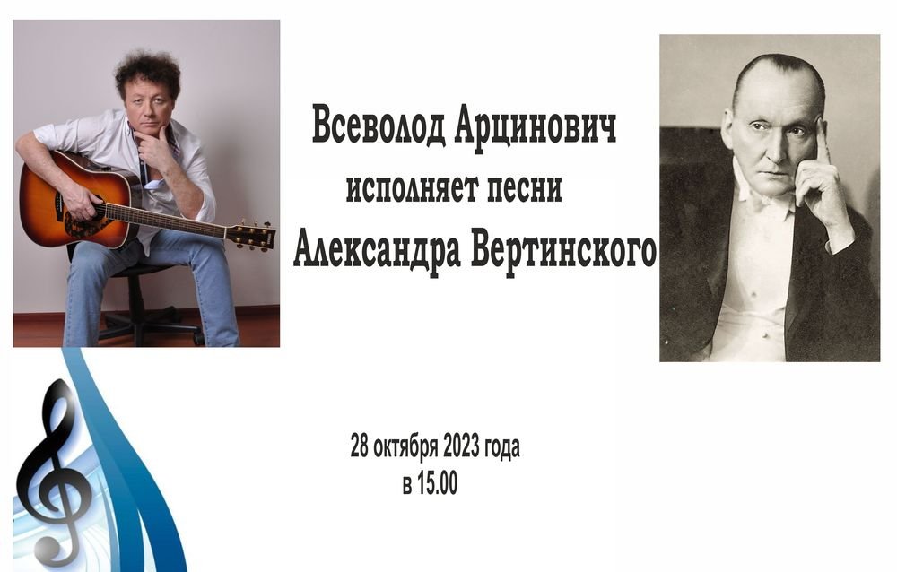 28 октября 2023г. в рамках музыкального проекта «БАРДЫ» состоялся творческий вечер Всеволода Арциновича с программой «Песни Александра Вертинского». — Всеволод Арцинович — лауреат всероссийских песенных фестивалей и конкурсов («Есенинские струны», «Бард-Эрмитаж», «Помни, товарищ» и другие), автор более ста песен, композитор, аранжировщик, работает в жанрах от классического бадовского до бард-рок. В программе прозвучали композиции из репертуара Александра Николаевича Вертинского. Видеосъёмка Вадима Васковского.