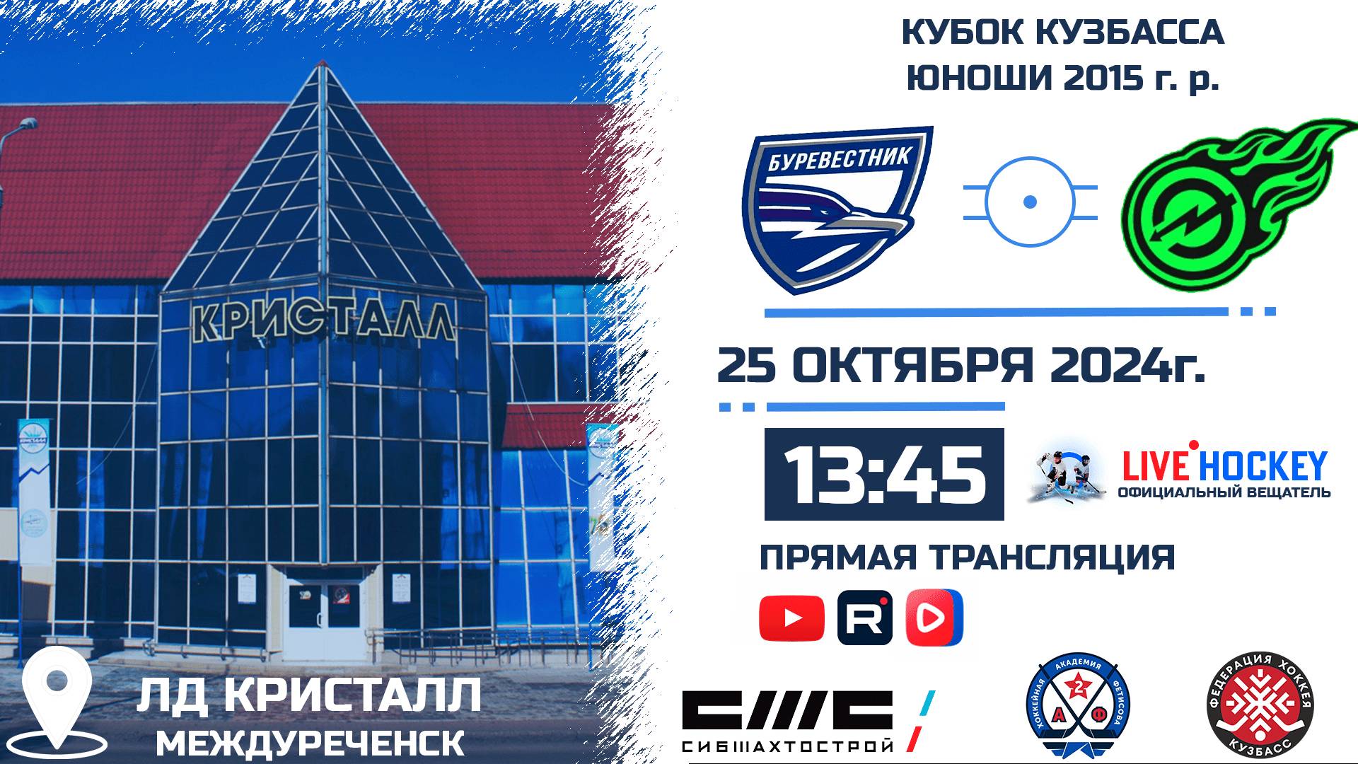 ПРЯМАЯ ТРАНСЛЯЦИЯ МАТЧА 25.10.2024г. в 13.45 БУРЕВЕСТНИК 2015 (Томск)-ЭНЕРГИЯ СОСНОВЫЙ 2015 (Кемерово). КУБОК КУЗБАССА. Сезон 2024-2025. Комментаторы: Графика: С графикой (таймер, табло). Стадион: ЛД КРИСТАЛЛ. г. Междуреченск. ТРАНСЛЯЦИЯ НА YouTube: https://youtube.com/live/HzMhKRvdSLk?feature=share ТРАНСЛЯЦИЯ В СООБЩЕСТВЕ VK: