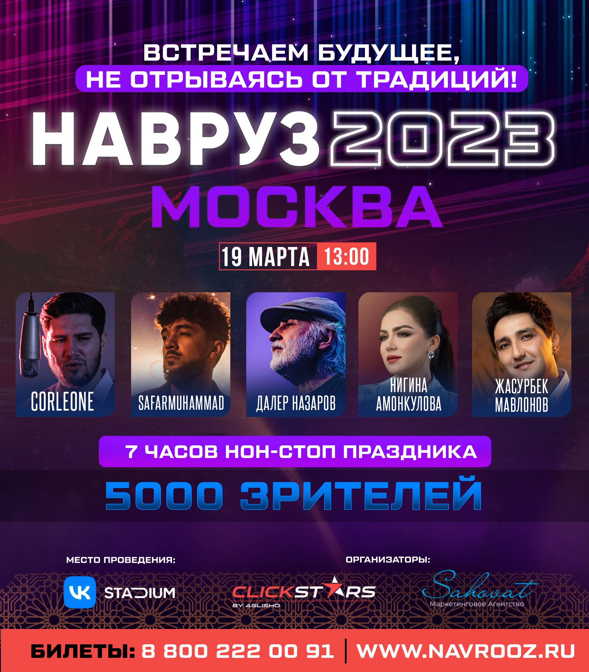 воскресенье 19 марта, 13:00 VK Stadium 6+ Эту весну ты запомнишь надолго! Ведь тебя и 5000 зрителей, ждет красивый праздник восточной музыки. НАВРУЗ - 2023 в Москве. 7 часов нон-стоп праздника с участием таджикских и узбекских артистов. Главный хитмейкер последних лет, чьи песни , наверняка, есть и в твоем плей-листе - Сафармухаммад. Представитель узбекской эстрады - талантливый Жасурбек Мавлонов. Топ всех музыкальных хип-хоп чартов Таджикистана - Корлеон! Нигина Амонкулова с песнями, которые давно прописались в сердцах слушателей ! Специальный гость: легендарный Далер Назаров! Ну а разбавит вечер музыки юмором - известная юмористка Халимахоним. Но и это еще не все! Вас ждут модные показы и увлекательные мастер-классы, выставки и интерактивные фото-зоны, стрит-фуд и конечно же суманак! 19 марта! Москва! VK стадиум! Навруз объединяет! ВАЖНО! Часть вырученных от продажи билетов средств, пойдут на помощь пострадавшим от схода лавин в ГБАО , Таджикистан.