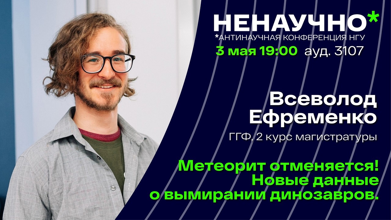 Почему на самом деле вымерли динозавры? Ответ на этот вопрос знает Всеволод Ефременко, магистрант Геолого-геофизического факультета НГУ. Он представил свой доклад в рамках антинаучной конференции. А если вы хотите весело и познавательно провести время, то приходите уже завтра в 19.00 в аудиторию 3107! Вас ждут лучшие доклады от самых харизматичных спикеров! Если вы не из НГУ, то зарегистрируйтесь по ссылке: https://docs.google.com/forms/d/e/1FAIpQLSeDJCzVD6pQDuS57Zik1jhfce1ghi6rfKDULnhXzcy3kbxEnQ/viewform, и вас пропустят на мероприятие! Подробности: https://vk.com/nenauchno