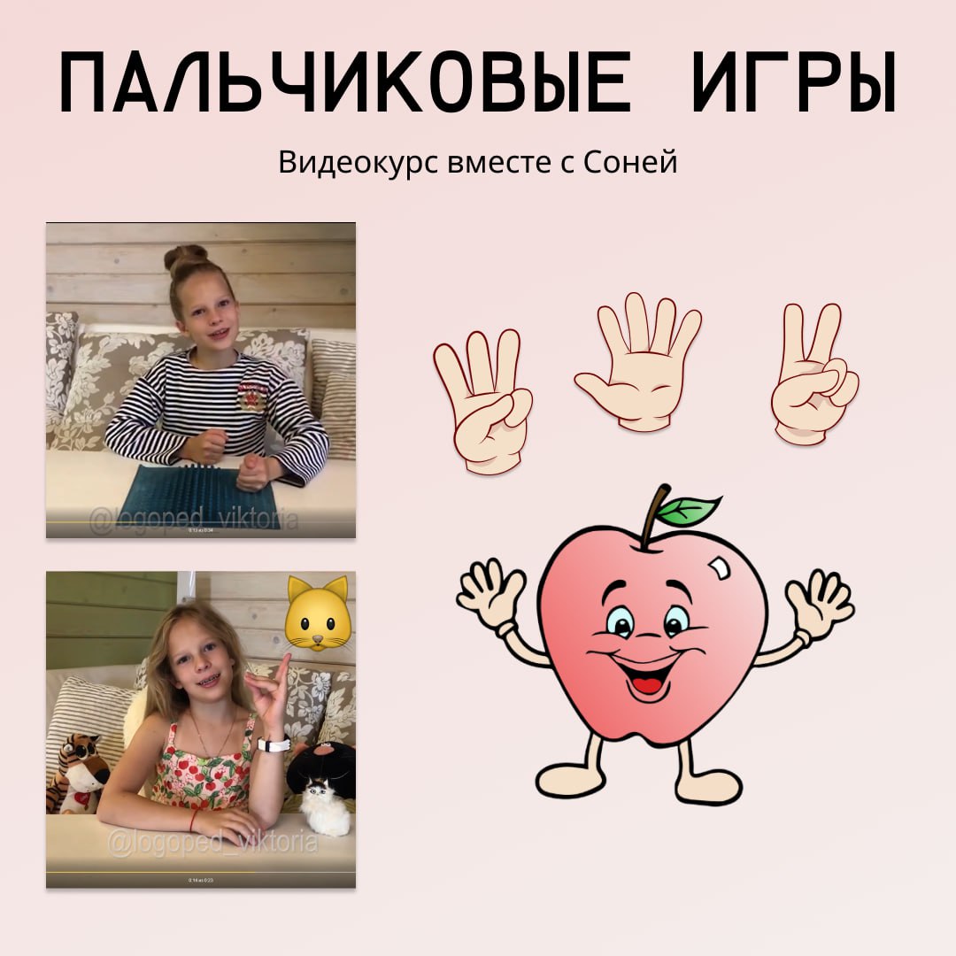 ? А знаете ли вы о том, что пальчиковые игры развивают не только пальцевый, но и МАНУАЛЬНЫЙ ПРАКСИС (целенаправленное движение)? Пальчиковая гимнастика - это не только развитие мелкой моторики, но и имитация, формирование праксиса, чувства ритма. И конечно же это веселая игра! Сейчас на сайте скидка на видеокурс "Пальчиковые игры вместе с Соней"⤵️ https://logoped-viktoria.ru/palchikovie-igri ? 10 видеоуроков ? Упражнения демонстрирует семилетняя Соня ? Развитие мелкой моторики, речи и памяти ? Укрепление взаимосвязи между полушариями головного мозга. ?♀️Главная героиня - Соня, младшая из моих трёх дочерей.