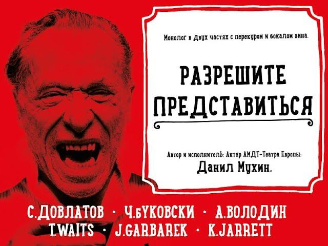 Место: Санкт-Петербург, Театральная Гостиная Vinci, Б.Пушкарская 29 17 декабря в 19.00 Спектакль «Разрешите представиться» - это простой разговор о жизни, отношениях с самим собой, религией, близкими людьми, женщинами. Здесь нет места фальши и лжи. Строчки из произведений разных авторов, отражающие нашу сегодняшнюю жизнь как она есть, без прикрас и пафоса, но с тонким юмором и любви к ней. В спектакле использованы произведения С. Довлатова, Ч. Буковски, А. Володина Звучит музыка Тома Вейтса, Кейта Джарретта и Яна Гарбарэка Автор и исполнитель: актер АМДТ-Театр Европы Данил Мухин Купить билет: http://vk.cc/5Nwync Забронировать: http://vk.cc/5NwS78 В стоимость билета входит welcome drink (бокал вина/чай/кофе) #театр #событие #Довлатов #VINCI #декабрь #спектакль #пьеса #литература #город #Буковски #Володин #моноспектакль #анонс17 декабря в 19.00 Спектакль «Разрешите представиться» - это простой разговор о жизни, отношениях с самим собой, религией, близкими людьми, женщинами. Здесь нет места фальши и лжи. Строчки из произведений разных авторов, отражающие нашу сегодняшнюю жизнь как она есть, без прикрас и пафоса, но с тонким юмором и любви к ней. В спектакле использованы произведения С. Довлатова, Ч. Буковски, А. Володина Звучит музыка Тома Вейтса, Кейта Джарретта и Яна Гарбарэка Автор и исполнитель: актер АМДТ-Театр Европы Данил Мухин Купить билет: http://vk.cc/5Nwync Забронировать: http://vk.cc/5NwS78 В стоимость билета входит welcome drink (бокал вина/чай/кофе) #театр #событие #Довлатов #VINCI #декабрь #спектакль #пьеса #литература #город #Буковски #Володин #моноспектакль #анонс