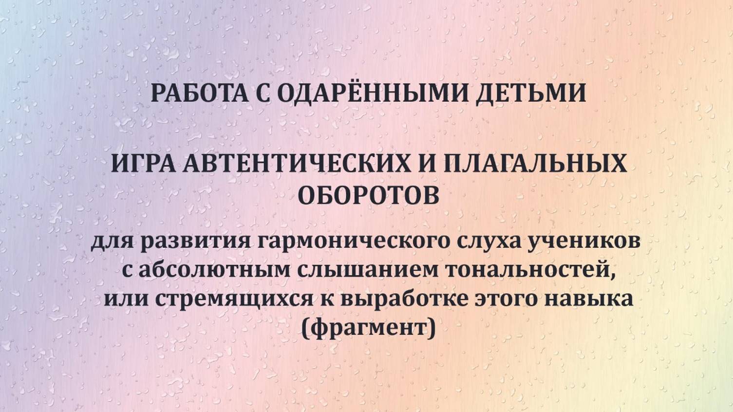 В видео показана работа с одаренным учеником. Задача - играть прослушанные автентические и плагальные обороты с целью развития навыка абсолютного слышания тональностей и гармонических функций (на примере главных трезвучий лада). Гармонические обороты от тонического трезвучия в мелодическом положении основного тона (примы) определяет и играет ученик 3 класса школы искусств № 6 г. Донецка, ДНР - Давыдов Павел (фортепиано), 8 лет. Фрагмент. При прослушивании ученикам следует обращать внимание на ведение верхнего звука тонического аккорда: если I ступень в сопрано идет вниз в VII – это автентический оборот, в который входит вводный звук; если верхний звук тоники остается на месте – это плагальный оборот, в котором I ступень это общий звук тоники и субдоминанты.