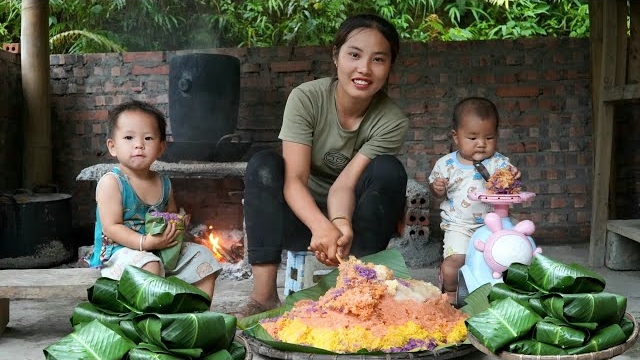 Мама поневоле. Дуонг. Готовим с детьми клейкий рис пяти цветов и несем его на продажу. Серия 117