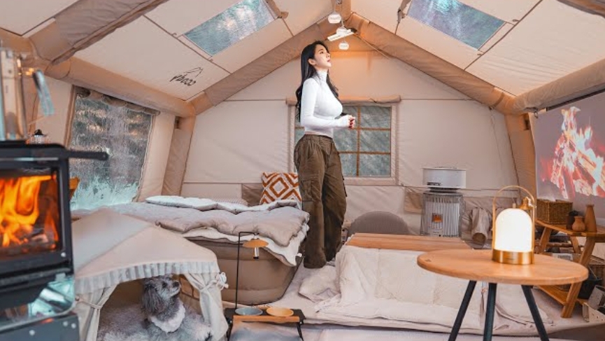 Кемпинг в палатке с горячей печкой. Тепло и уют.