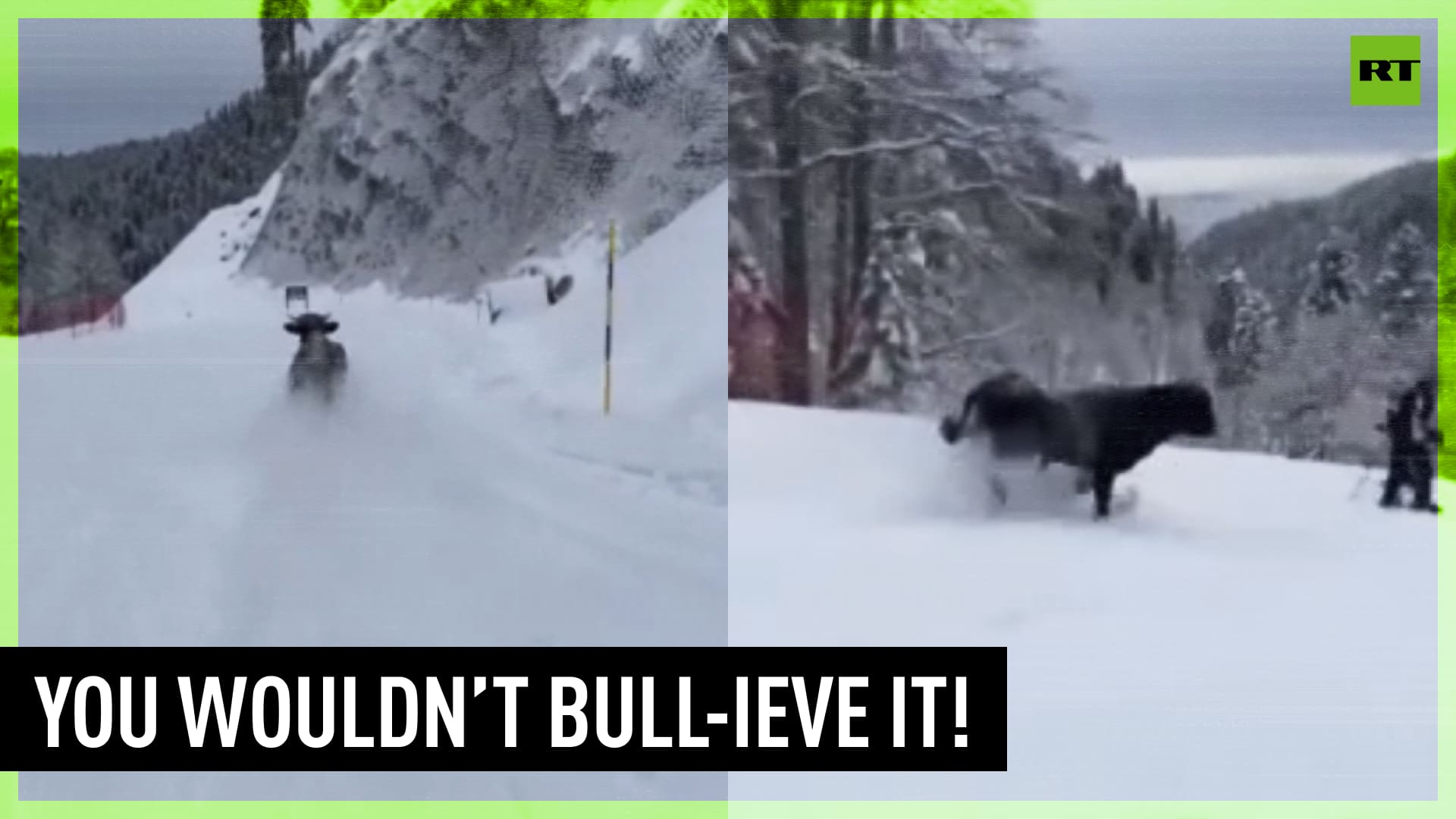 A bull wandered onto the slopes of the Rosa Khutor ski resort near Sochi, and even raced one skier who was bold enough to film the unique slalom. Eyewitnesses claim the animal managed to butt 3 people, but mostly only damaged skis and snowboards. How the animal got onto the slope is unclear, but rescuers have already arrived at the scene and are trying to catch him. ------------------------------------------------------------------------------------- Freedom over censorship, truth over narrative. Follow us on Facebook: https://www.facebook.com/RTnews Follow us on Telegram: https://t.me/rtnews Follow us on Twitter: https://twitter.com/RT_com
