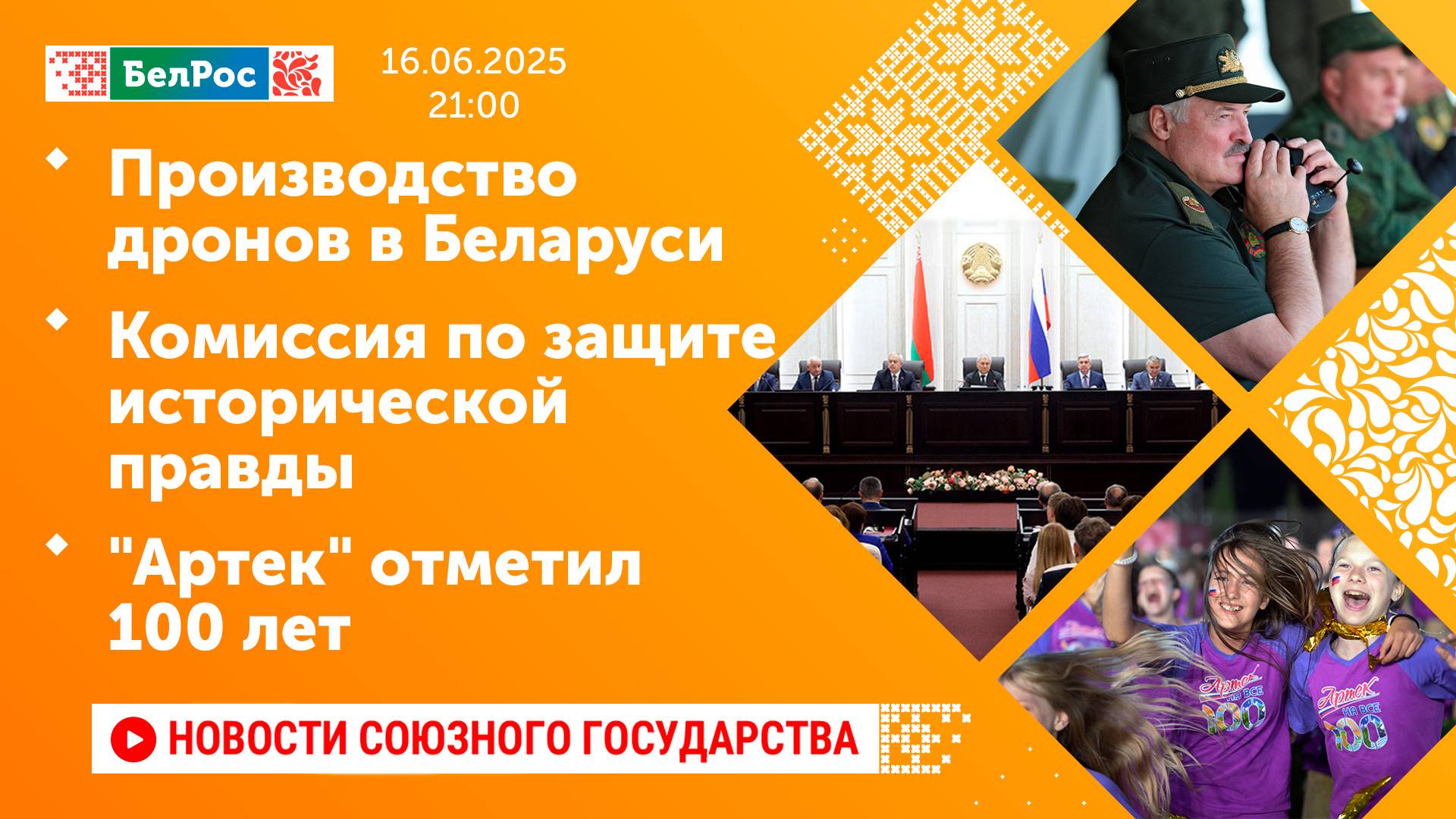Закадровый текст озвучивает *ИИ Антон* Новости 16.06.2025 на 21:00 - Развитие производства дронов в фокусе внимания Александра Лукашенко. - Россия завершила передачу 6060 тел бойцов ВСУ. - В Союзном государстве будет создана комиссия по защите исторической памяти. - Лагерь "Артек" отметил юбилей - 100 лет! Смотрите главные новости Союзного государства на телеканале БелРос. Ссылки на наши соц. сети Сайт: http://belros.tv/ Telegram: https://t.me/belrostv Одноклассники: https://ok.ru/group/55657426976918 ВКонтакте: https://vk.com/belrostv TikTok: https://www.tiktok.com/@belros_tv?_t=... RuTube: https://rutube.ru/channel/23501830/ Яндекс. Дзен: https://zen.yandex.ru/belrostvv Наши подкасты на Яндекс. Музыке: https://music.yandex.ru/album/25615251 #главныеновости #новостисегодня #СоюзноеГосударство