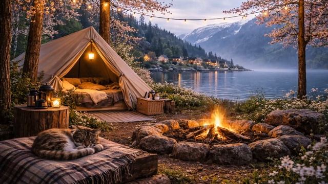 Уютный весенний вечер у скандинавского фьорда с костром, палаткой и мягким светом гирлянд. Атмосферное расслабляющее видео для сна, отдыха, медитации и фонового просмотра. Тёплый костёр мягко потрескивает, вода отражает огни, цветущие деревья колышутся на ветру, а уютная палатка с тёплым светом создаёт ощущение полного спокойствия и уединения. Рядом отдыхает кот, добавляя сцене ещё больше уюта. Видео идеально подходит для: • расслабления и снятия стресса • сна и медитации • фонового просмотра • работы и концентрации • создания спокойной атмосферы дома Погрузитесь в атмосферу весеннего уюта, природы и гармонии. весенний вечер, костёр, кемпинг, фьорд, уютное видео, видео для сна, релакс, медитация, природа, расслабляющее видео, фон для телевизора, атмосфера, кот, уют