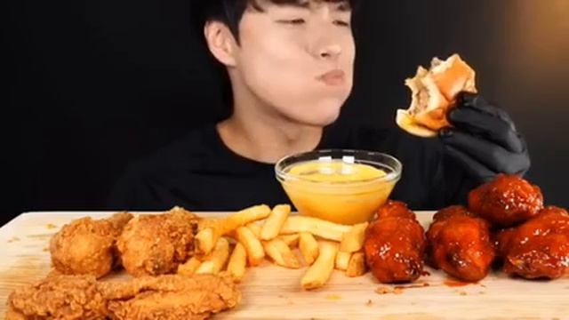 Хрустящий мукбанг курица, картофель фри, бургер Еда на камеру