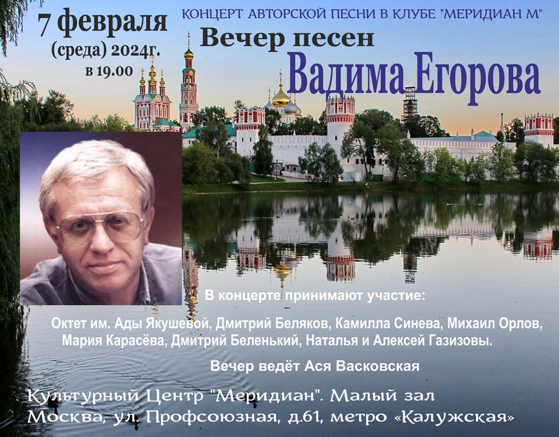 7 февраля (ср.) 2024 года в клубе авторской песни «Меридиан М» состоялся «Вечер песен Вадима Егорова». Вадим Егоров - один из ярчайших звезд из созвездия «Поющего педагогического института». Его песни одновременно лиричны, нежны, философски глубокомысленны. Они завораживают зрителя и опьяняют его легкой дымкой романтики и волшебства. В концерте принимают участие: Октет им. Ады Якушевой, Дмитрий Беляков, Камилла Синева, Михаил Орлов, Мария Карасёва, Дмитрий Беленький, Наталья и Алексей Газизовы.