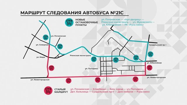 Теперь по этому маршруту ходит автобус 21С. Он идет из микрорайона Энергетик до улицы Куйбышева. От Куйбышева автобус идет сначала на улицы Безыменского и Радищева, затем выезжает к парку Добросельский и развлекательному центру Руськино. А вот дальше у него появляются новые остановки: улица Юбилейная, Жуковского, Рпенская магистраль и Арт-дворец. Остановок на улице Мира, Большой Нижегородской и Добросельской у маршрута 21С теперь нет.
