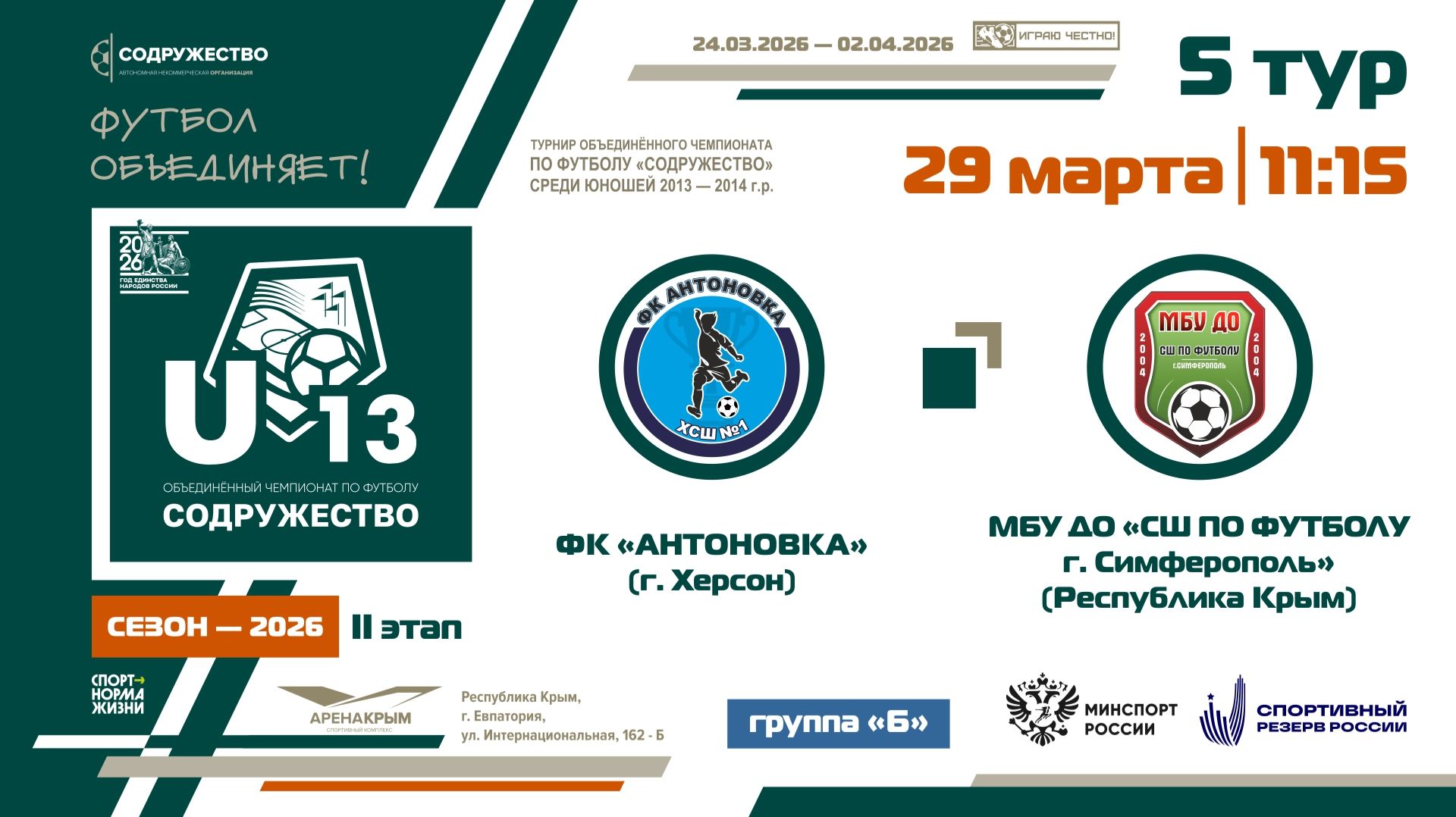 5 ТУР [Группа Б] | ФК «Антоновка» (г. Херсон) - МБУ ДО «СШ по футболу» (г. Симферополь) | 29.03.2026