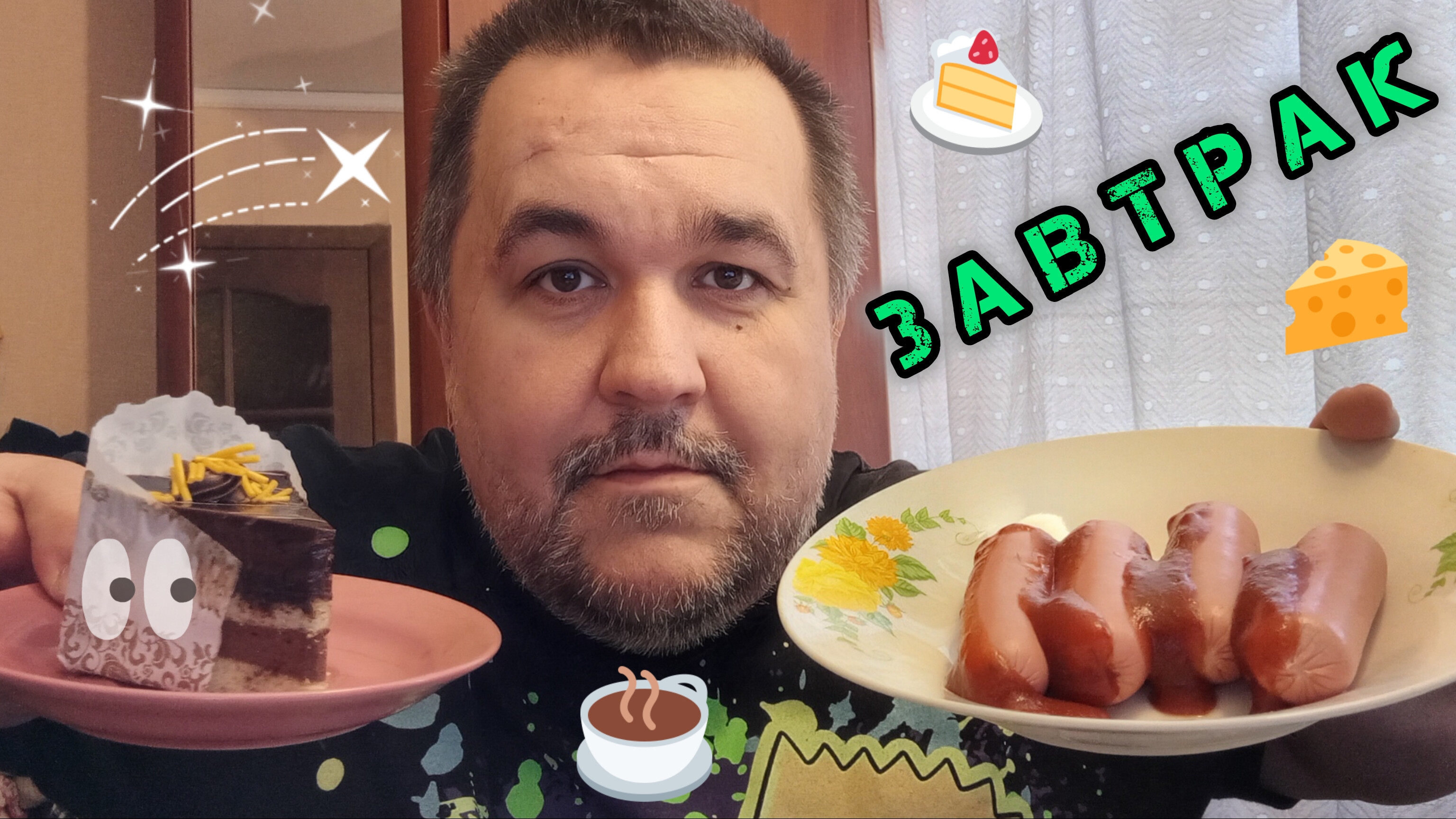 Обжор завтрак - бутеры с сыром, тортик, сосисоны