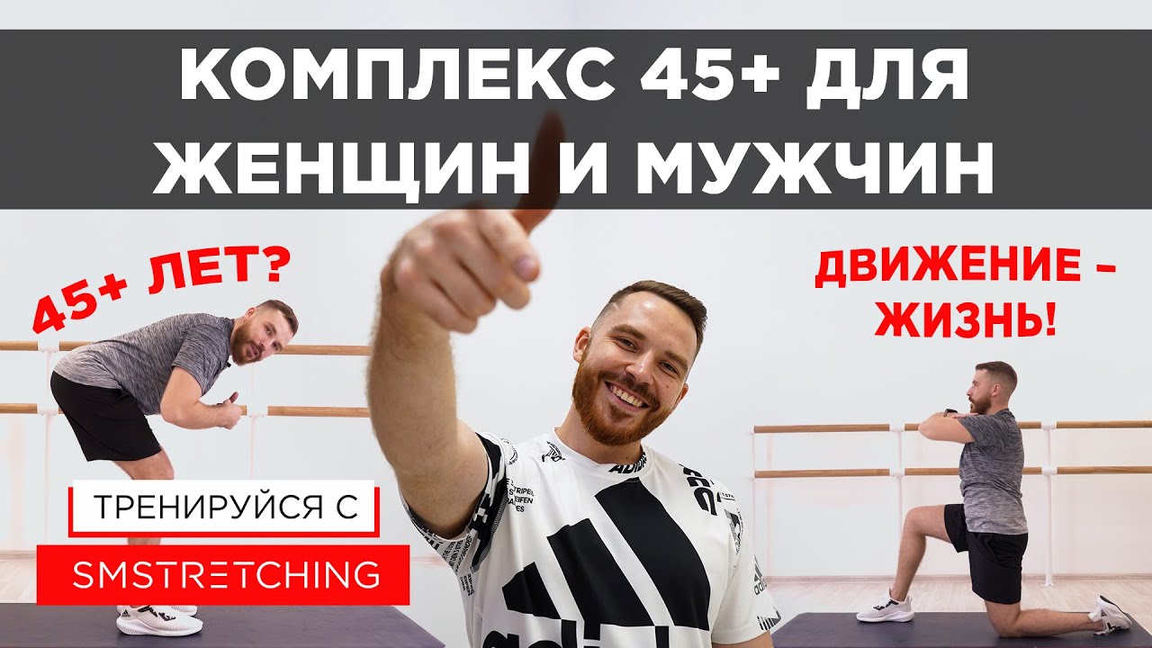Привет! Этот комплекс на движение - для взрослых (45+) и даже пожилых (60+ лет) наших зрителей! Хочешь заниматься с нами онлайн полноценно? Быстрей записывайся на марафон - https://smstretching.ru/marathon Программа тренировок, гайд по питанию и поддержка тренеров по низким ценам ??? Еще больше активностей на нашем сайте - https://smstretching.ru/ Конечно, в душе мы все еще молоды! Но тело людей старше 45 и 50 лет порой дает о себе знать с не самой приятной стороны... Виной тому, прежде всего, сидячий образ жизни и возрастные изменения. Даже если вы еще не пенсионер, не бабушка и не дедушка - эти упражнения помогут вам прийти в тонус и дать организму нужную нагрузку. Ну а если вы еще старше, то физкультура для пожилых и упражнения для взрослых вам просто необходимы. Недаром говорят, что движение - жизнь! Зарядку для пенсионеров никто не отменял! В этом комплексе Денис собрал упражнения, которые подойдут как для женщин, так и для мужчин в возрасте 45+. Но на самом деле - они будут полезны даже, если вы все все еще юны и молоды. Словом - для всех возрастов и уровней подготовки! Рекомендуем повторять эту тренировку хотя бы 2-3 раза в неделю. Если нагрузки не хватает - выполнить упражнения можно в несколько кругов ? ❗❗❗ Осторожно! Если у вас есть хронические травмы или вы просто почувствовали сильную боль, выполняя этот комплекс, то обязательно сделайте паузу! Возможно вы дали телу слишком большую нагрузку. Если боль не уходит, обязательно обратитесь к врачу! НЕ ПЕРЕУСЕРДСТВУЙТЕ! Поехали! ??? Список упражнений: === 0:22 Работа тазом в выпаде (левая нога вперед) 2:40 Работа тазом в выпаде (правая нога вперед) 4:37 Ягодичный мост поэтапно 7:35 Ягодичный мост с подъемом ног попеременно 8:32 Упор с движением руки и ноги (диагональ) 10:51 Наклоны стоя с отведением таза === Запишись на онлайн-марафоны SMSTRETCHING (новые потоки по спецпрограммам стартуют каждые две недели!) - https://smstretching.ru/marathon Купи наши онлайн-курсы со скидкой (стретчинг и барре) - https://smstretching.online/ Участвуй в live-классах - https://smstretching.ru/live SMSTRETCHING - это шесть студий растяжки и фитнеса чемпионки России и Мира по художественной гимнастике Самиры Мустафаевой в Москве и Лос-Анджелесе. А также - онлайн-курсы и фитнес-туры, которые мы организуем по всему миру. Приходи на тренировки в студии SMSTRETCHING - https://smstretching.ru/trainings Подпишись на наш Instagram и всегда будь в курсе событий - https://www.instagram.com/smstretching/ Почта для сотрудничества - hello@smstretching.com