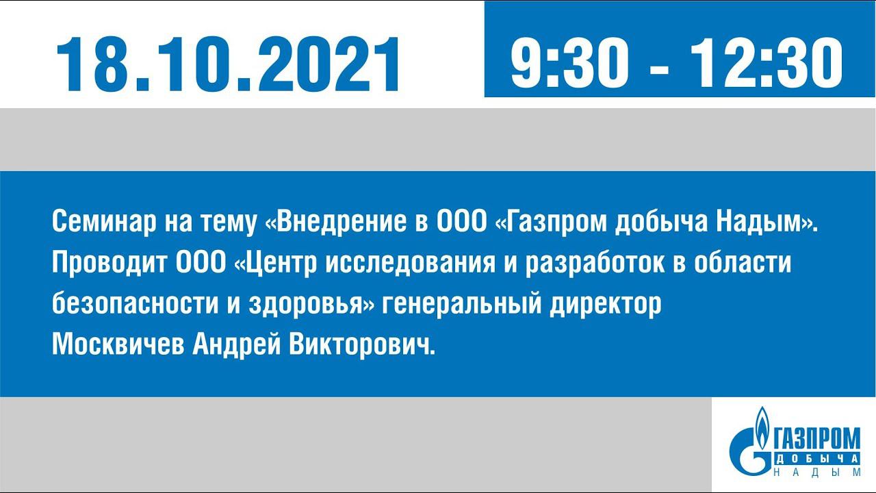Семинар на тему «Внедрение в ООО «Газпром добыча Надым» требований новых правил по охране труда и изменений в трудовом законодательстве». Консультационный семинар проводит генеральный директор ООО «Центр исследования и разработок в области безопасности и здоровья» Москвичев Андрей Викторович. 18 октября 2021 года. 9:30-12:30. Часть 1.