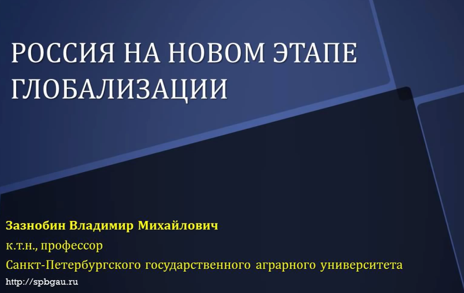 дата публикации: 2 июля 2013 Выступление В.М. Зазнобина с докладом: "Россия на новом этапе глобализации" 20 - 21 июня 2013 г., в СПбГАУ на Международной, межвузовской научно-практической конференции, посвященной 150-летию со дня рождения В.И. Вернадского «Россия перед лицом глобализации» Обсуждение посвящено следующим направлениям: Отечество или космополитизм? Деидеологизация или ценностная идеология? Свобода или либерализм? Российская ментальность и ее современные проявления Многонациональность и многоконфессиональность Будущее России в условиях глобализации www.spbgau.ru