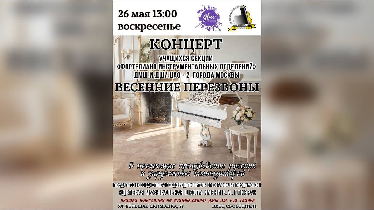 Концерт учащихся секции "Фортепиано инструментальных отделений" ДМШ и ДШИ ЦАО г. Москвы "Весенние перезвоны" в Детской музыкальной школы имени Р.М. Глиэра (Москва) Прямая трансляция из Большого концертного зала Детской музыкальной школы им. Р.М. Глиэра 26 мая (воскресенье) 2024 года в 13.00 Ведущая концерта Ирина Савинова Видеомонтаж и звукорежиссура: Пётр Зайцев https://www.youtube.com/channel/UCA7svoo1tTIhUd4m3tE_8CA/videos Благодарим компанию "Yamaha Music" за помощь в подготовке трансляции и предоставленное оборудование "Steinberg". Подписывайтесь на социальные сети наши музыкальной школы: ВК: https://vk.com/shkolagliera Канал в Youtube: https://www.youtube.com/channel/UCv8DpupMz9kkAmdjzKUE0XQ Telegram-канал: https://t.me/dmshgliera