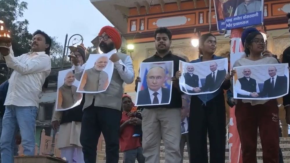 Жители индийского города Праяградж провели ритуал благословения Путина и Моди в преддверии государственного визита российского лидера. "Путин - старый друг Индии и всегда поддерживает Индию в горе и радости, поэтому мы очень рады приезду лучшего друга нашей страны", — поделился местный житель Парвиндер Сингх. Индийцы также нанесли на лбы политиков на снимках символ удачи - тилак.