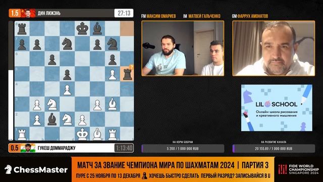 Промокод для онлайн-школы рисования Lil.School — BOBR; ссылка https://clck.ru/3EroFh Годовой курс «Школа победителей» ждёт тех, кто хочет рост рейтинга и 1-й разряд — https://bit.ly/winners-wc2024 ♔ Трансляция важнейшего события в мире шахмат - матча за звание чемпиона мира Дин - Гукеш ⏱ Начало трансляций в 12:00 МСК Игровые дни: 25-27, 29-30 ноября. 1, 3-5, 7-9, 11-12 декабря. Тай-брейк: 13 декабря. Выходные – 28, ноября. 2,6,10 декабря Призовой фонд – 2,5 миллиона долларов Комментируют: GM Фаррух Амонатов и IM Матвей Гальченко, а так же мастер FIDE Максим Омариев Донат – https://www.donationalerts.com/r/chessmaster Оперативные новости в нашем телеграм – https://t.me/ChessMaestro Обучение шахматам с кайфом – https://school.chessmaestro.ru Подписаться на канал – https://goo.gl/nY2kmn ♕ Получите книгу «21 критическая ошибка в шахматах» бесплатно – http://chessmaestro.ru/21mistakeyoutube Наши проекты – https://taplink.cc/chessmaster #ChessMaster #шахматы