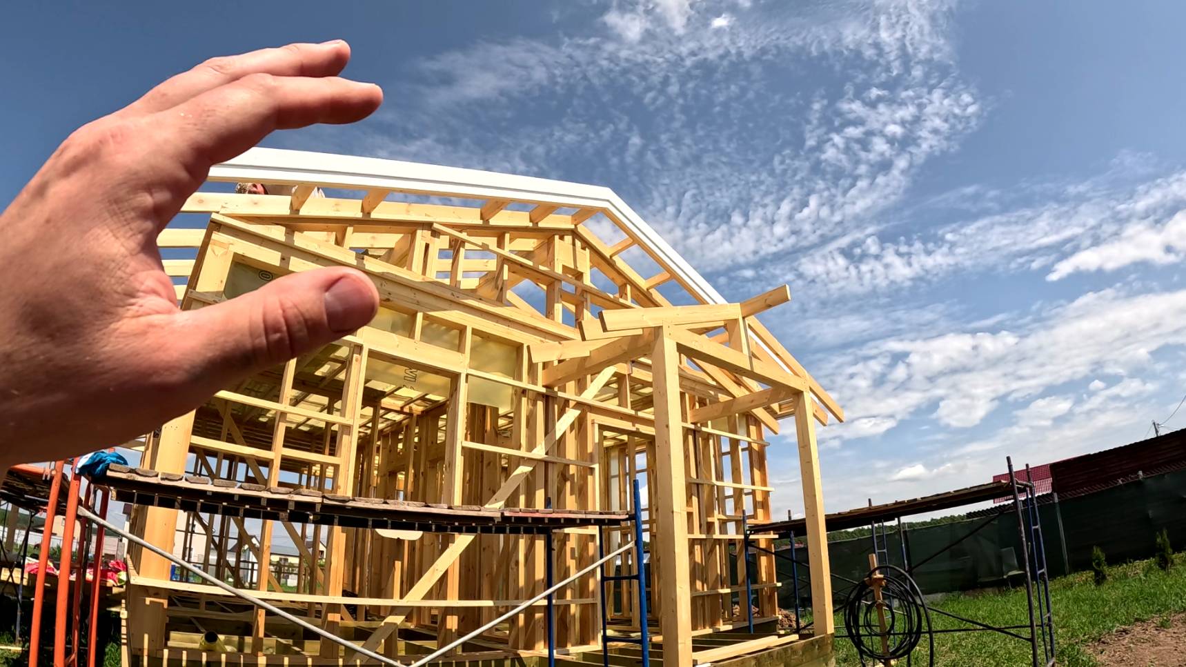 Обзор дачного участка и каркасного дома на этапе. Кессон. Грядки. Бытовка обустройство.