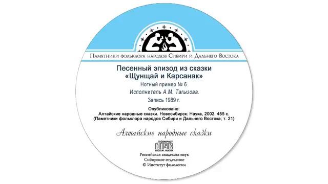 Песенный эпизод из сказки «Щунщай и Карсанак», челканский диалект, нотный пример № 6. Исполнитель А.М. Тагызова. Запись 1989 г. Опубликовано: Алтайские народные сказки. Новосибирск: Наука, 2002. 455 с. (Памятники фольклора народов Сибири и Дальнего Востока; т. 21).