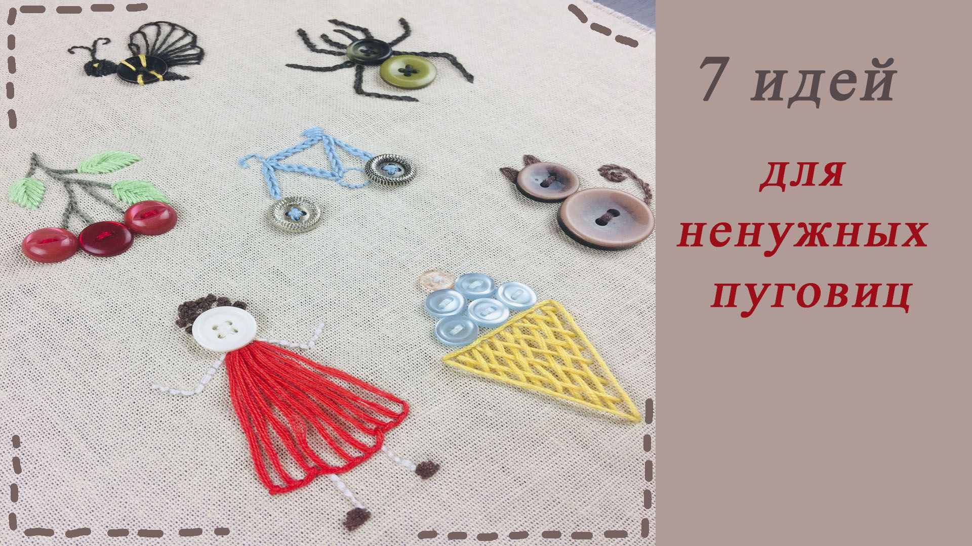 У всех дома есть груда ненужных пуговиц. Несложно превратить их с помощью основных гладьевых швов в красивые элементы декорирования одежды и предметов интерьера. Зеленый паук или девочка с кудряшками, спелая вишня или голубой велосипед … Что угодно можно изобразить с помощью фантазии и творческого вдохновения. Вы можете освежить любую вещь использовав ненужные пуговицы и остатки ниток. Элементы декорирования: 1. Декоративный элемент паук - 00:00 2. Декоративный элемент кошка - 01:25 3. Декоративный элемент мороженое - 03:31 4. Декоративный элемент девочка - 04:45 5. Декоративный элемент вишня - 06:50 6. Декоративный элемент пчела - 08:18 7. Декоративный элемент велосипед - 11:14 Гладьевые швы: 1. Тамбурный шов - 00:44 2. Стебельчатый шов - 01:53 3. Двусторонняя гладь - 02:57 4. Вышиваем решетку - 04:04 5. Петельный шов - 05:00 6. Шов назад иголка - 05:39 7. Французский узелок - 06:14 8. Шов рыбья кость - 07:07 9. Косая гладь - 07:45 10. Петельный шов - 08:39 11. Шов назад иголка - 09:52 12. Французский узелок - 10:28 13. Тамбурный шов - 11:36 Благодарю Всех за просмотр! Всем добра и позитива! ?Мой канал на Яндекс дзен: https://zen.yandex.ru/embroidery ?Мой канал на Rutube: https://rutube.ru/channel/23939952/ ?Мой канал на Youtube: https://www.youtube.com/c/Шитьсамойздорово ?Мой магазин тканей - https://www.livemaster.ru/tkani2 . Красивые, качественные ткани с быстрой доставкой по России. Отправка в течении суток после оплаты. Смотрите ещё видео по вышивке гладью для новичков: Не выкидывайте остатки от рукоделия. Превратите их в уютные вещи для дома: https://dzen.ru/video/watch/637000411e58e41dc92a98e7 Покажу как можно освежить выцветшие шторы, если у Вас есть 3 минуты: Покажу как можно освежить выцветшие шторы, если у Вас есть 3 минуты: https://dzen.ru/video/watch/629e5d2ca47be328a534383b Не поверите – из этого можно вышить красивый цветок-оберег для дома: https://dzen.ru/video/watch/62154a378bf0b80304127939 Вышиваю объёмный цветок с помощью карандаша: https://dzen.ru/video/watch/6202cd2a7f3d7d446b2b8689 Не поверите, какой красивый цветок получился из этого: https://dzen.ru/video/watch/61f9752fbeff2219ec16e9f3 Не поверите, какой красивый цветок получился из этого!: https://dzen.ru/video/watch/61e877955d30f7192c0de9fa Не выкидывайте ненужные пуговицы – превратите их в стильный элемент декора: https://dzen.ru/video/watch/61df3c9b0ace753528933340 5 самых простых способов вышить объёмный цветок: https://dzen.ru/video/watch/61db5999ae3ef0265651d89f 7 идей декорирования с помощью ненужных пуговиц и основных швов: https://dzen.ru/video/watch/61c2393a06081a0f5134a528 Покажу как сделать красивую вышивку на клапанах к новому платью: https://dzen.ru/video/watch/615b79a29525c028dbe9f02d Не ожидала такого от своей швейной машинки: https://dzen.ru/video/watch/61111e8b4e48b14821b51137 Вышиваем вместе: вышивка на одежде: https://dzen.ru/video/watch/6109b4bd6e57be7d268dfac6 Шьём платье из муслина с ручной вышивкой на воротнике: https://dzen.ru/video/watch/60b73ee93efca05eed1f7528 Вышивка на воротнике платья | Вышивка на одежде: https://dzen.ru/video/watch/60af538aa6a8397bbaa9937c Вышивка гладью основные стежки с использованием крючка, бисера и бусин: https://dzen.ru/video/watch/609d9baacc145612f8f66137 11 самых необходимых стежков гладью: https://dzen.ru/video/watch/5ff4d4debb14d54ffb0768f4 Вышивка гладью на одежде: Бабочка: https://dzen.ru/video/watch/5fd6784e64f2df1897150c81 Вышивка гладью на одежде: Клубничка: https://dzen.ru/video/watch/5fcfe33d4b6f9b5380bf3cc5 Красивая вышивка на льняной салфетке: https://dzen.ru/video/watch/5fb82a059d2ffe38ee7f1b5c Вышивка гладью: вышиваем мухомор: https://dzen.ru/video/watch/5f80c95d109c65627ec2c79f Украшаем детские платья из журнала Burda кружевом и вышивкой: https://dzen.ru/video/watch/5f56989c3b3fcc0674b5f62e Украшаем джемпер вышивкой: https://dzen.ru/video/watch/5f39457dd57467193249739c Вышиваем "Зайца в сказочном лесу": https://dzen.ru/video/watch/5f2db116bbe8572b808f99da Вышивка гладью для начинающ