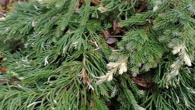 Вариегатный можжевельник-две разные фактуры ветвей на одном кусту. апрель 2022