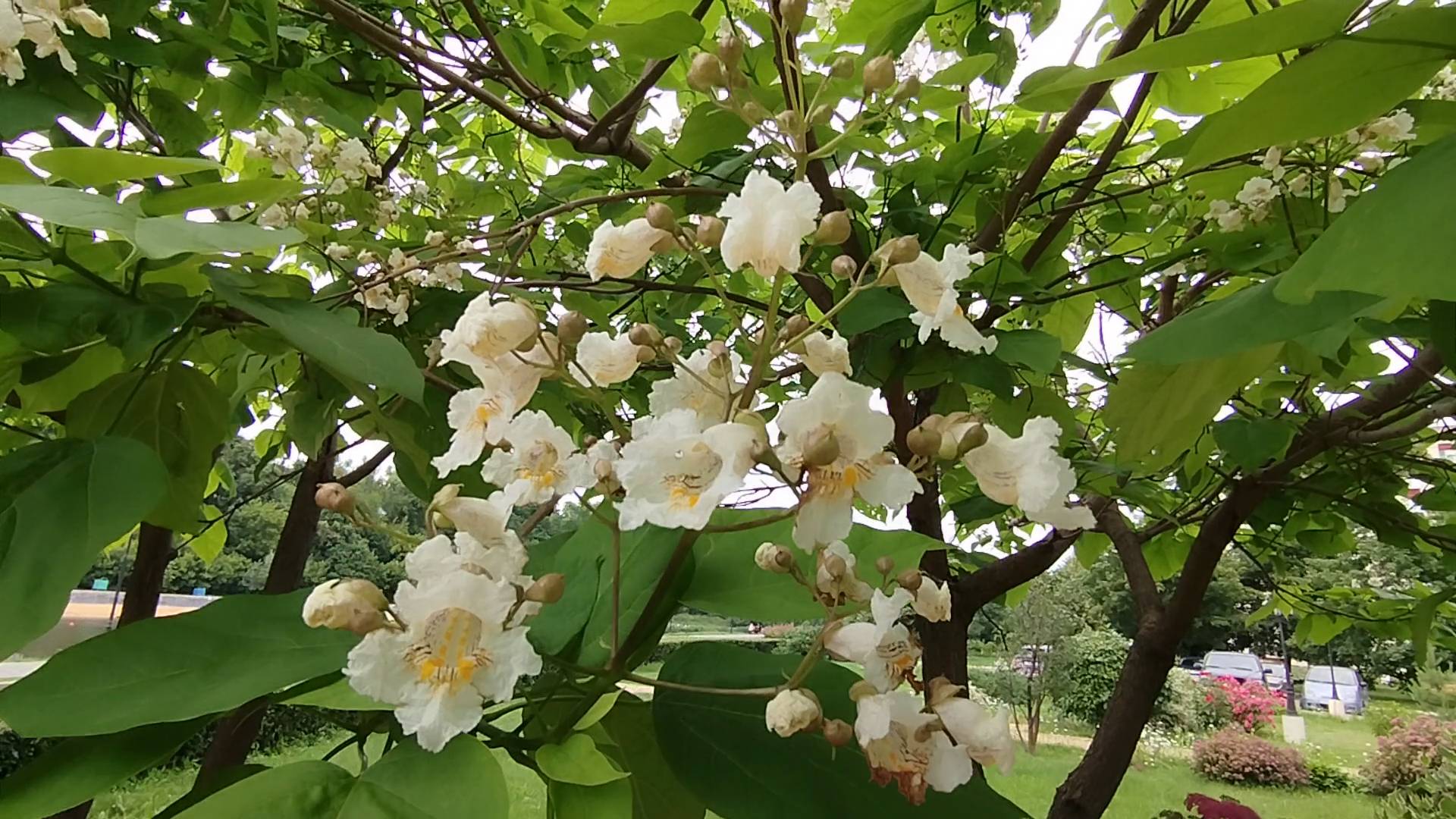 Белые цветы на дереве, дерево катальпа
