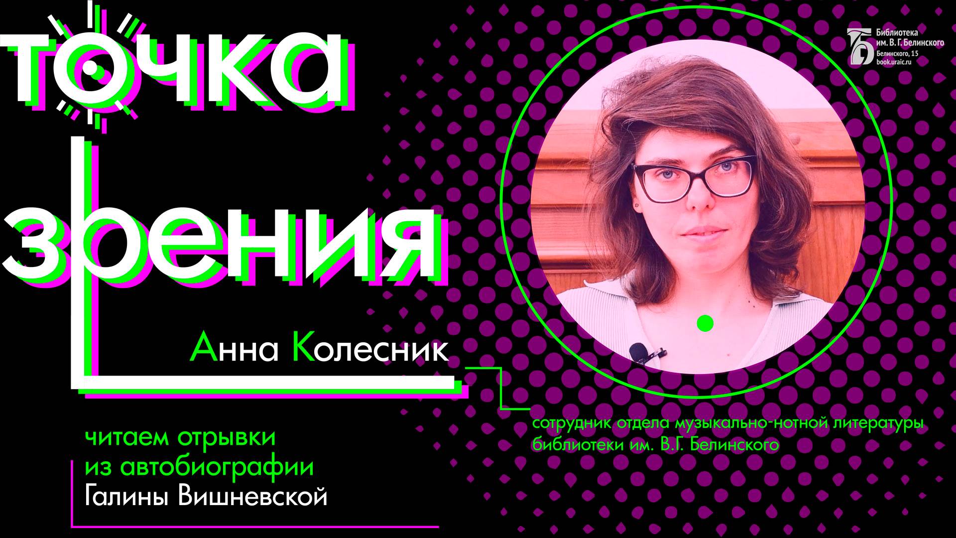 О книге «Галина : история жизни» (автобиография Галины Вишневской). Спикер: музыковед Анна Колесник. Камера, монтаж: Анна Порошина. Свердловская областная универсальная научная библиотека им. Белинского http://book.uraic.ru/ сайт https://vk.com/club6745014 VK