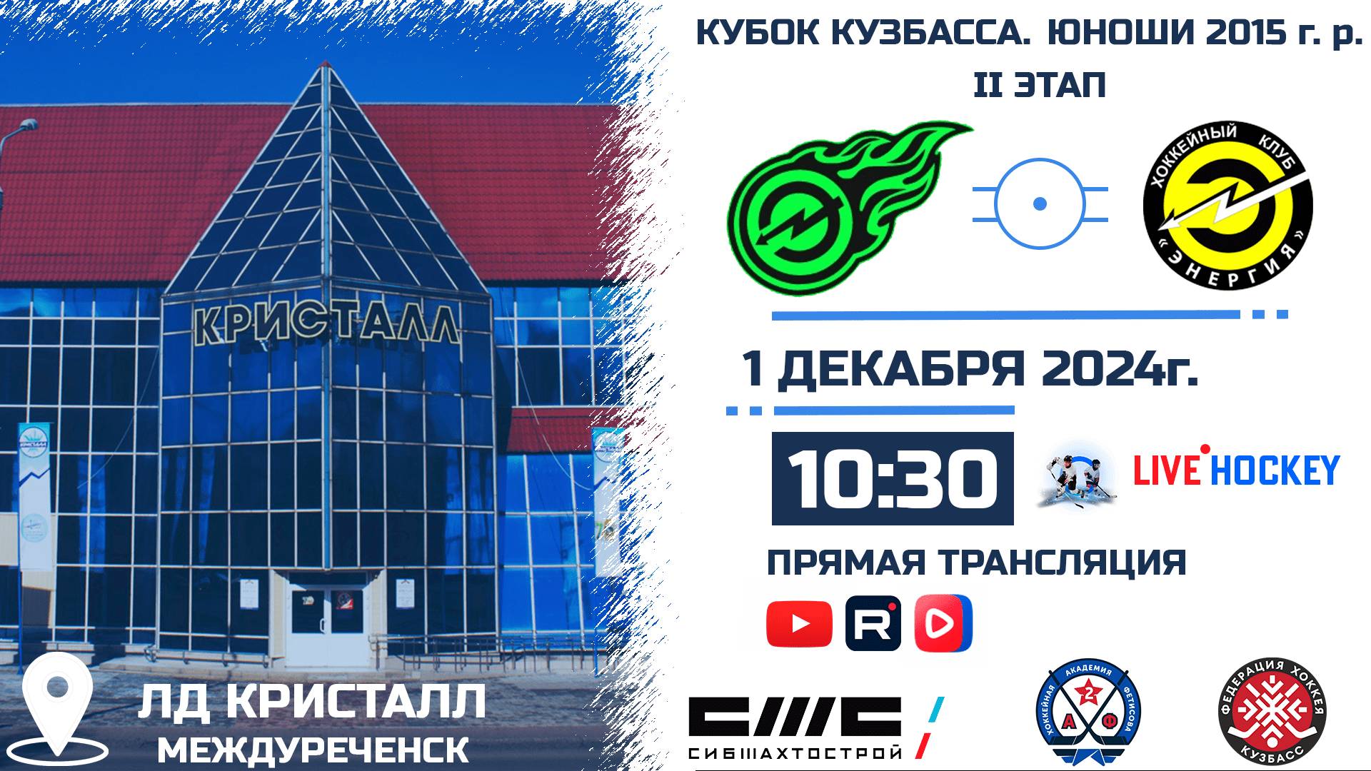 ПРЯМАЯ ТРАНСЛЯЦИЯ МАТЧА 01.12.2024г. 10:30 ЭНЕРГИЯ СОСНОВЫЙ (Кемерово) VS ЭНЕРГИЯ-1 (Кемерово) КУБОК КУЗБАССА СРЕДИ ЮНОШЕЙ 2015 г.р. ССЫЛКИ НА МАТЧИ: https://bit.ly/TYTCLICK СТАДИОН: ЛД КРИСТАЛЛ КОММЕНТАТОРЫ: НАДЕЖДА ТЕПЛОУХОВА ТРАНСЛЯЦИЯ НА YOUTUBE: https://youtube.com/live/AvRgsyZKc7s?feature=share