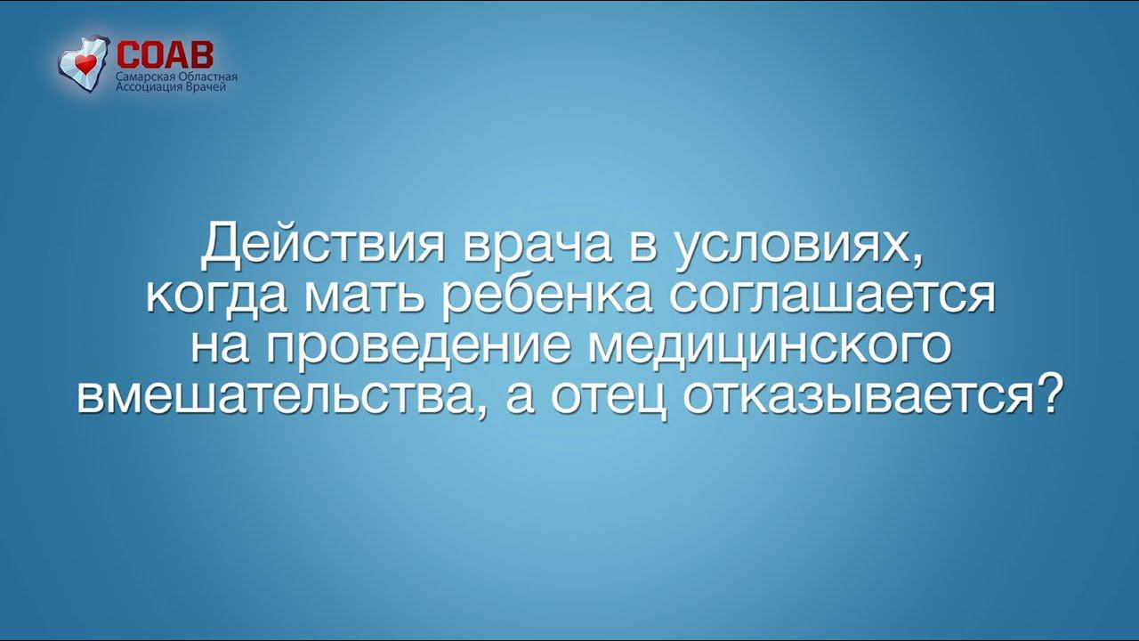 Социальный проект правовой грамотности: Действия врача в условиях, когда мать ребенка соглашается на проведение медицинского вмешательства, а отец отказывается? Отвечает: Бальзамова Лидия Алексеевна - к.м.н., доцент кафедры общественного здоровья и здравоохранения СамГМУ, вице-президент Самарской областной ассоциации врачей. Свои вопросы Вы можете оставлять в комментариях.