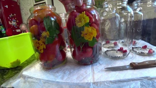Рецепт: - томаты - цветы бархатцев с семенной коробкой - острый перец - петрушка - смесь перцев - вода На 1 л маринада: - 4 ст. л. сахара - 1 ст. л. соли - 1 ст. л. уксуса 70%