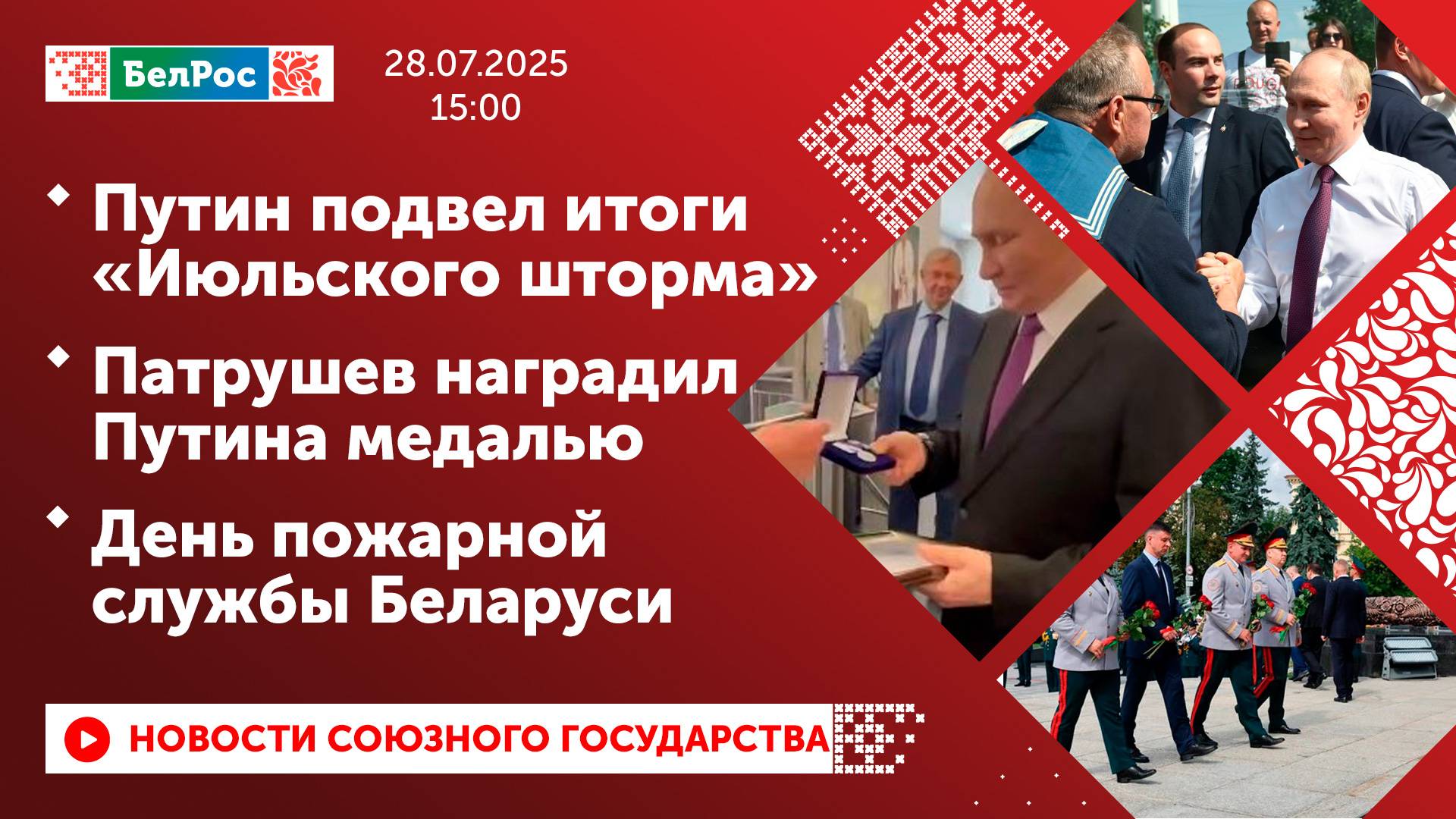 Закадровый текст озвучивает *ИИ Антон* Новости 28.07.2025 на 15:00 - Владимир Путин подвёл итоги учений "Июльский шторм". - Во время рабочей поездки Президент пообщался с жителями и гостями Санкт-Петербурга. - Владимир Путин награждён медалью Морской коллегии России. - В Минске отметили День пожарной службы. Смотрите главные новости Союзного государства на телеканале БелРос. Ссылки на наши соц. сети Сайт: http://belros.tv/ Telegram: https://t.me/belrostv Одноклассники: https://ok.ru/group/55657426976918 ВКонтакте: https://vk.com/belrostv TikTok: https://www.tiktok.com/@belros_tv?_t=... RuTube: https://rutube.ru/channel/23501830/ Яндекс. Дзен: https://zen.yandex.ru/belrostvv Наши подкасты на Яндекс. Музыке: https://music.yandex.ru/album/25615251 #главныеновости #новостисегодня #СоюзноеГосударство
