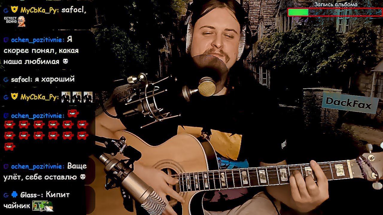 Мат и оскорбления - не рекомендуется. Финансовая поддержка: https://www.donationalerts.ru/r/dackfax 25-26 Апреля буду выступать на музыкальной сцене «Стрим-феста», г.Москва, Технопарк «Сколково» Приходи и поддержи любимого стримлира, билеты: http://streamfest.ru/speaker/dackfax Заказы: https://docs.google.com/document/d/1bV_nYYh2VZrrqTcAIlxPZ1BpbJ8128kf1hGR-JMOGQs/edit?usp=sharing Если тормозит, буферизация илЬ ещё чего странное происходит с трансляцией, сообщите о проблеме в ЛС и попробуйте перейти на: Твич, GG, Вконтакте. Твич: https://www.twitch.tv/dackfax GG: https://www.goodgame.ru/channel/DackFaX Вконтакте: https://www.vk.com/dackfax Инстаграм: https://www.instagram.com/dackfax Дискорд: https://discord.gg/KWkEVWS Сбербанк МИР: 2202 2009 1094 6522 QIWI Кошелёк: +79529705023 Яндекс Деньги: 410016891810710 Накормить: https://send.wtf/dackfax QIWI, Яндекс, Сбербанк и Накормить: анонимны и без оповещения на экране, но плюс в том что для стримера это без комиссии. Поддержка с оповещением на экране: 1: https://donatepay.ru/d/dackfax 2: https://streamlabs.com/dackfax 3: https://goodgame.ru/channel/dackfax/support Во время исполнения песни все оповещения стоят на паузе. Ютуб: https://www.youtube.com/user/alphapavel Скачать записи трансляций: https://yadi.sk/a/WBHVNDQM3Zp7bd Оборудование и ПО: https://docs.google.com/document/d/1O3V3IFv8kJA-3pDFVt2DAeljsKuv11ul8vCxw1sneGg/edit?usp=sharing Нина: https://www.youtube.com/channel/UCuTuebgg92JIByp2NCfg9JA Евгений: https://vk.com/altman_e Катя: https://www.youtube.com/channel/UCtQPxkyxHirRF7jKGn09vdg Антон: https://www.youtube.com/channel/UCuWqPqgPlPvO4RmtjsHpGrQ #живаямузыка #песниподгитару #живойзвук