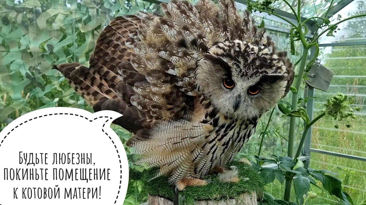 Кошка Морошка впервые зашла в вольер к сове после того, как Ёлка прогнала её, когда высиживала яйца.