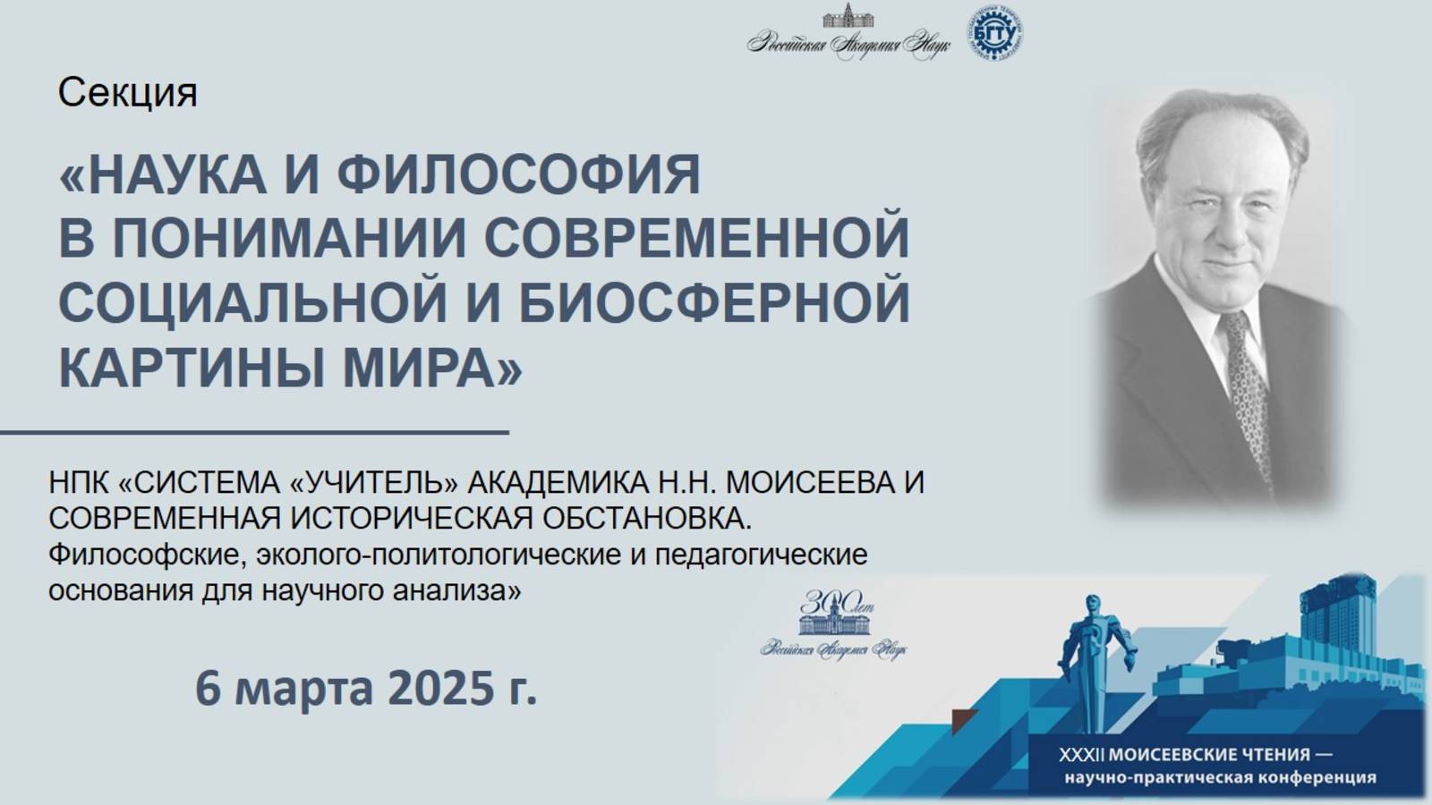 НПК «Система «Учитель» академика Н.Н. Моисеева и современность. Философские, эколого-политологические и педагогические основания для научного анализа». Заседание секции «Наука и философия в понимании современной социальной и биосферной картины мира».