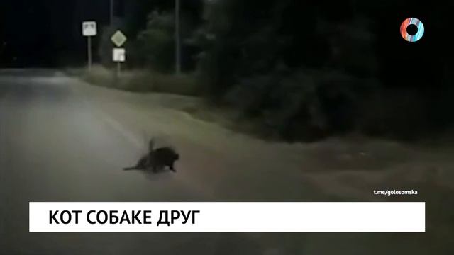 Помощь в трудную минуту. Мужчина из Рязани снял на видео, как два кота ночью переводили через дорогу собаку.