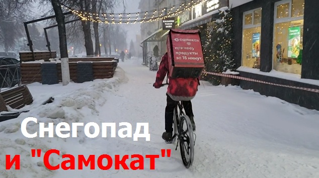 231214 Снегопад Самокат зима велосипедист улица Октябрьская ул Полесская магазин ВкусВилл город Орёл