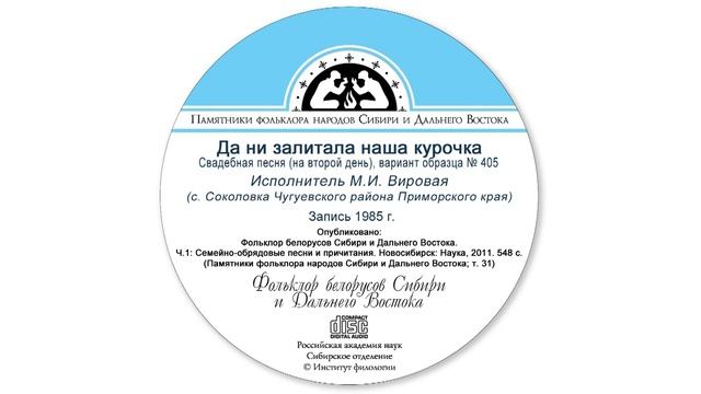 Свадебная песня (на второй день), вариант образца № 405. Исполнитель М.И. Вировая (с. Соколовка Чугуевского района Приморского края). Запись 1985 г. Опубликовано: Фольклор белорусов Сибири и Дальнего Востока. Ч. 1: Семейно-обрядовые песни и причитания. Новосибирск: Наука, 2011. 548 с. (Памятники фольклора народов Сибири и Дальнего Востока; Т. 31)