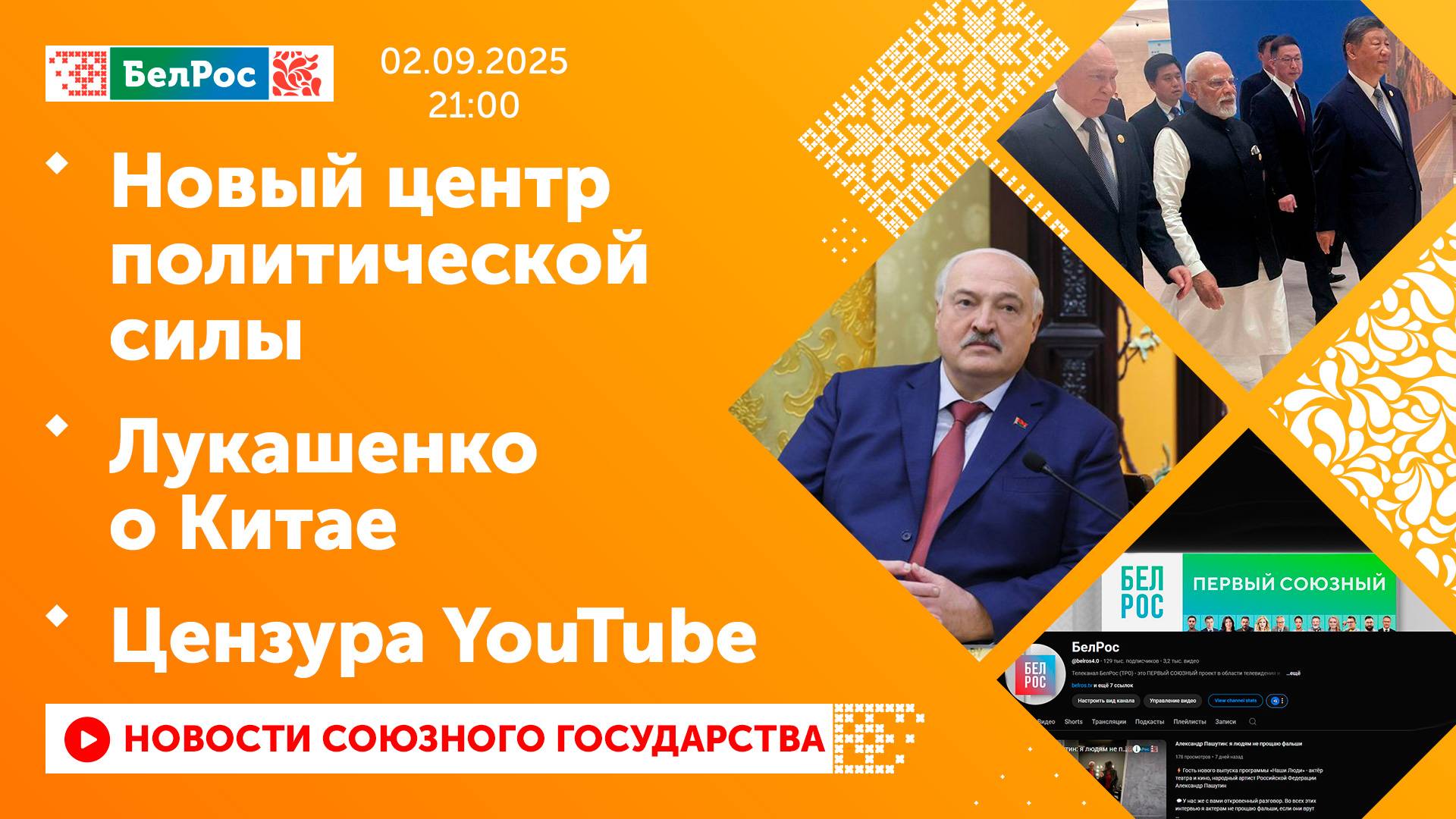 Закадровый текст озвучивает *ИИ Антон* Новости 02.09.2025 на 21:00 - Владимир Путин и Александр Лукашенко провели встречу в рамках визита в Китай. - СМИ: саммит ШОС показал единство лидеров России, Китая и Индии. - Александр Лукашенко: Минску и Пекину удалось выстроить основательный фундамент отношений. - Наш YouTube-канал "БелРос 4.0" - под угрозой блокировки. - Национальной ассоциации телерадиовещателей исполнилось 30 лет. Смотрите главные новости Союзного государства на телеканале БелРос. Ссылки на наши соц. сети Сайт: http://belros.tv/ Telegram: https://t.me/belrostv Одноклассники: https://ok.ru/group/55657426976918 ВКонтакте: https://vk.com/belrostv TikTok: https://www.tiktok.com/@belros_tv?_t=... RuTube: https://rutube.ru/channel/23501830/ Яндекс. Дзен: https://zen.yandex.ru/belrostvv Наши подкасты на Яндекс. Музыке: https://music.yandex.ru/album/25615251 #главныеновости #новостисегодня #СоюзноеГосударство