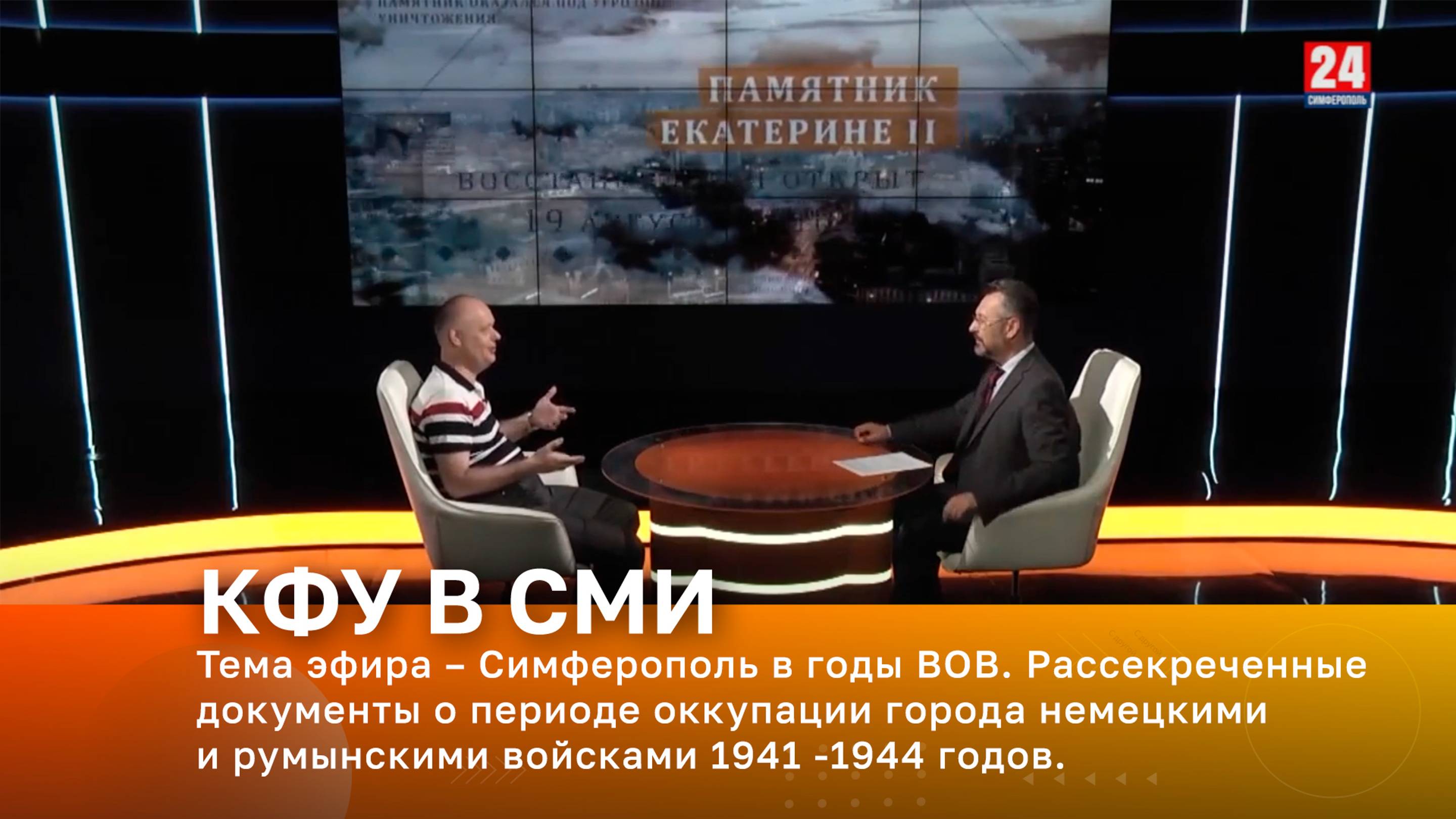 Телеканал «Крым 24». В эфире – профессор кафедры истории России КФУ им. В.И. Вернадского Олег Романько Тема эфира – Симферополь в годы ВОВ. Рассекреченные документы о периоде оккупации города немецкими и румынскими войсками 1941 -1944 годов.